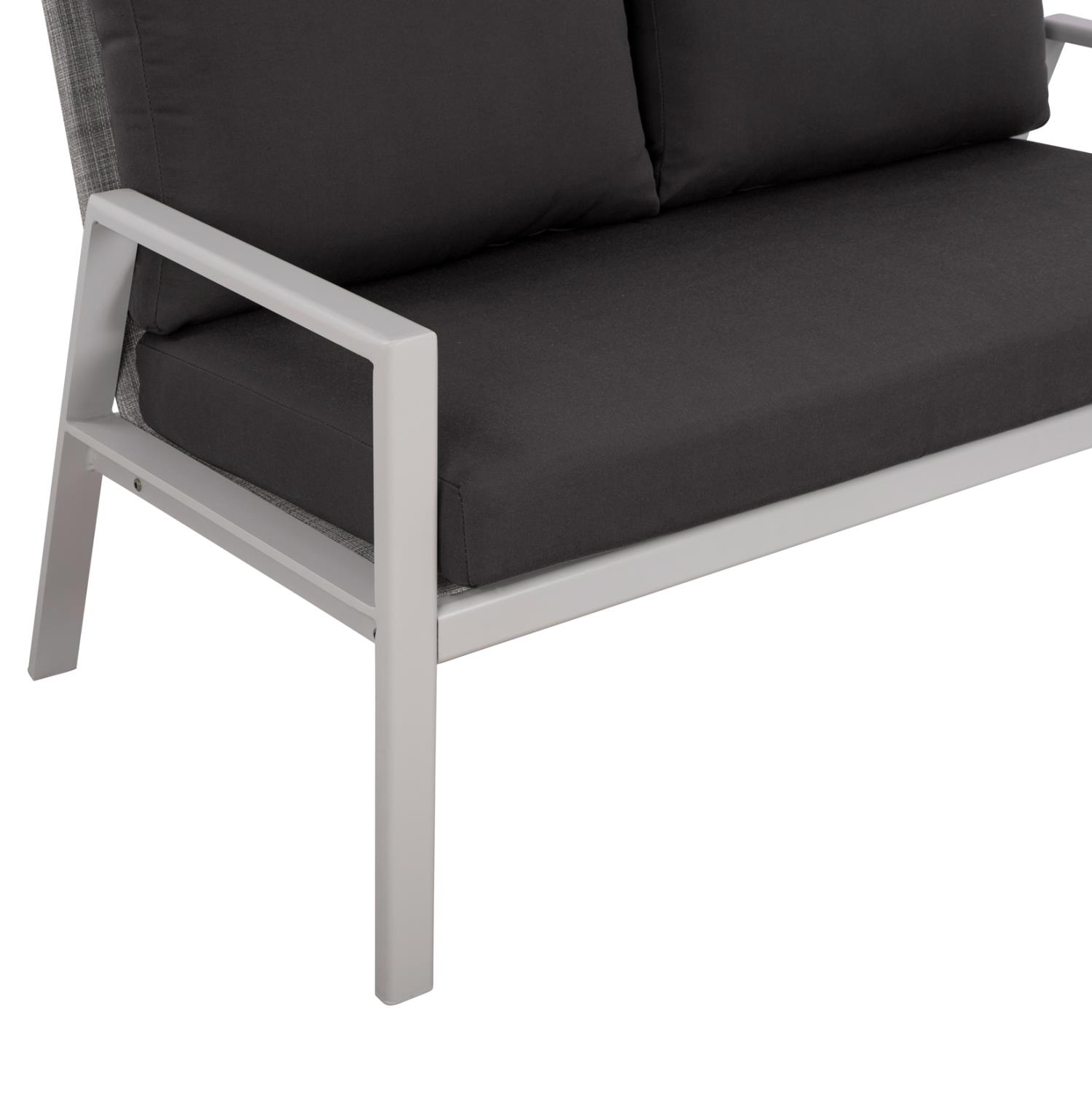 with textline fabric at the back and the seat in black color and pillows from fabric in grey color.