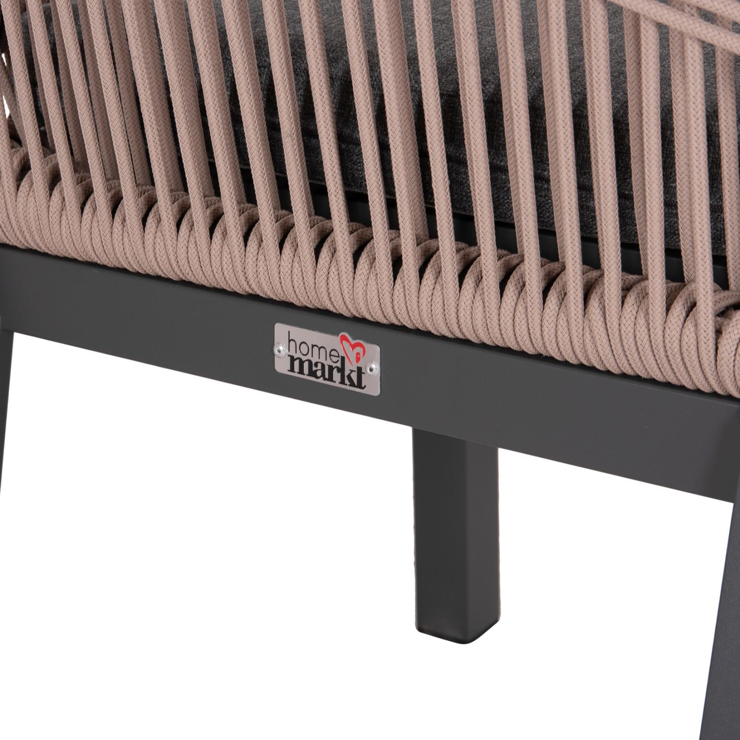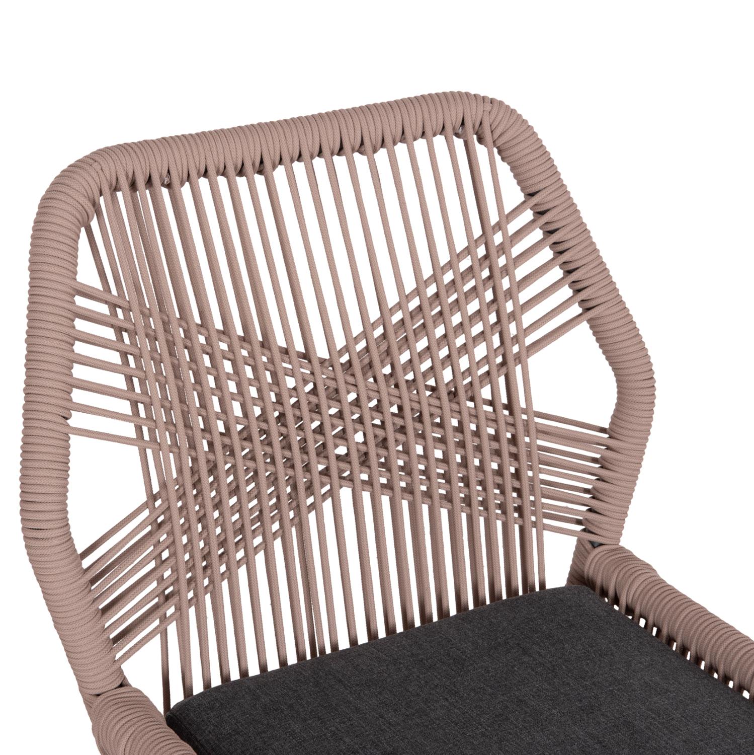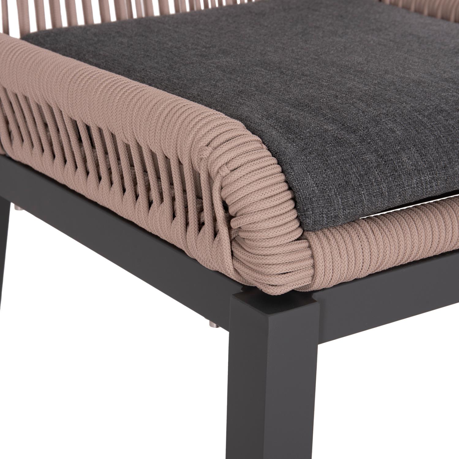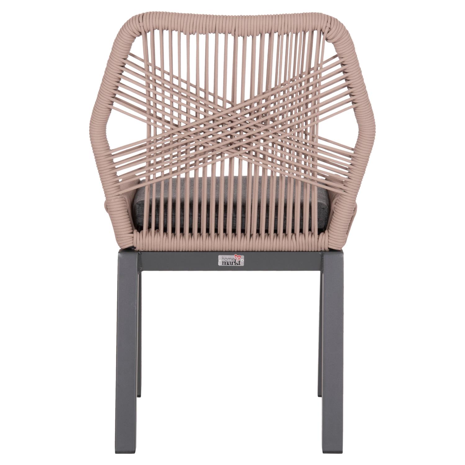 The HOWARD outdoor dining chair has an aluminum frame in DARK GREY color and a comfortable seat cushion in the same color. The backrest is made of TEXTILENE rope in BEIGE color. A quality proposal for both professional and domestic use.