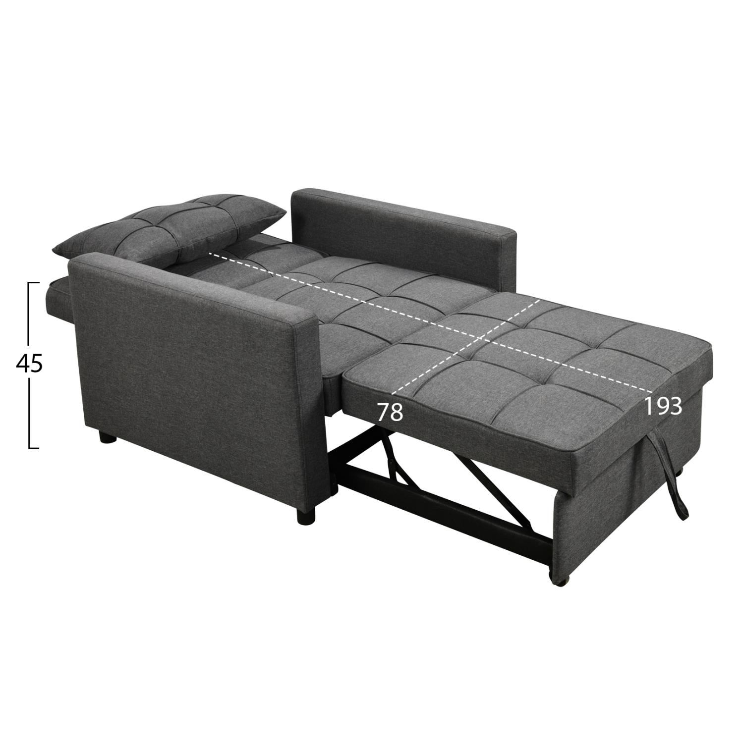 The MERO armchair-bed combines comfort, practicality and flexibility. Upholstered in GREY fabric, it incorporates a sliding, retractable bed with a strap and wheels, which is raised via a special mechanism when unfolding. The backrest offers two options for use, as it can either remain upright or “fall”, depending on the desired resting position.