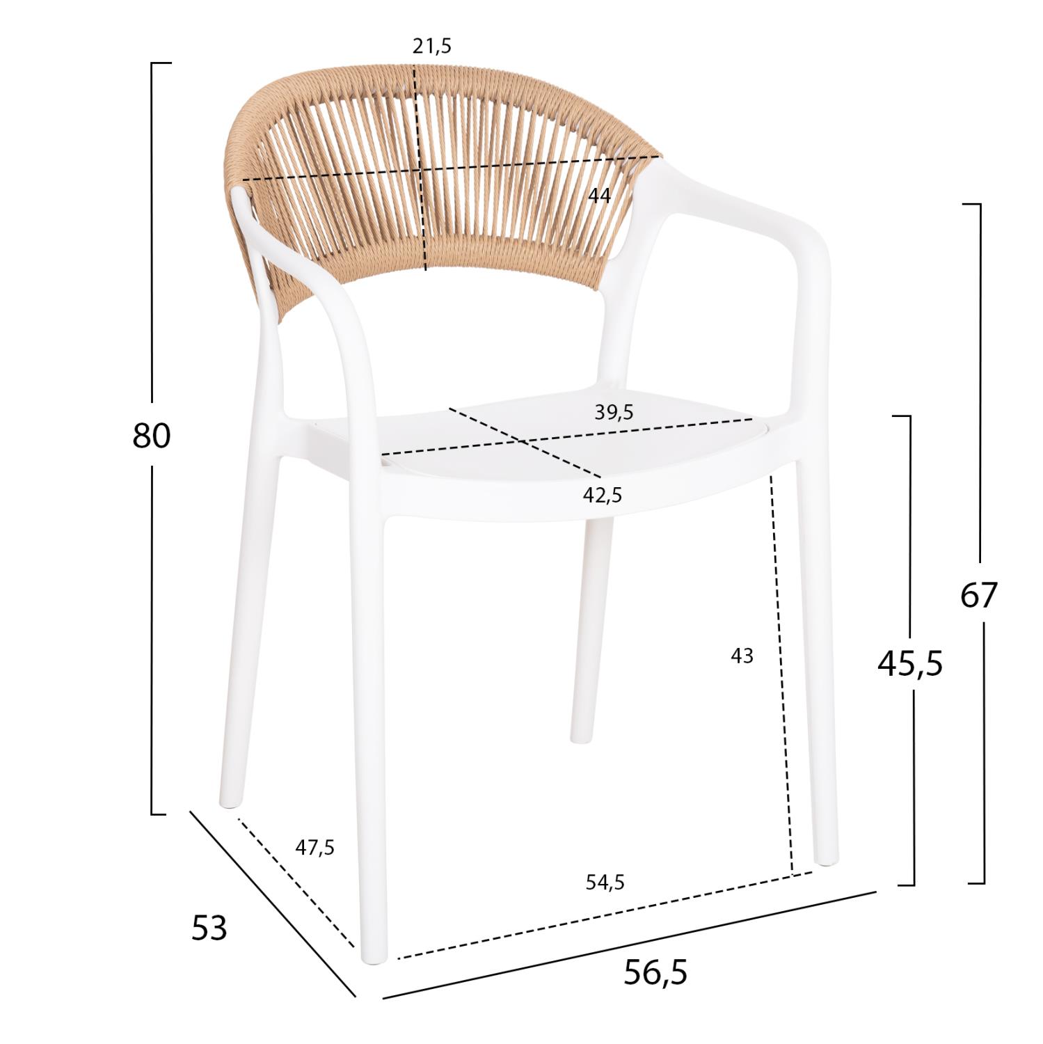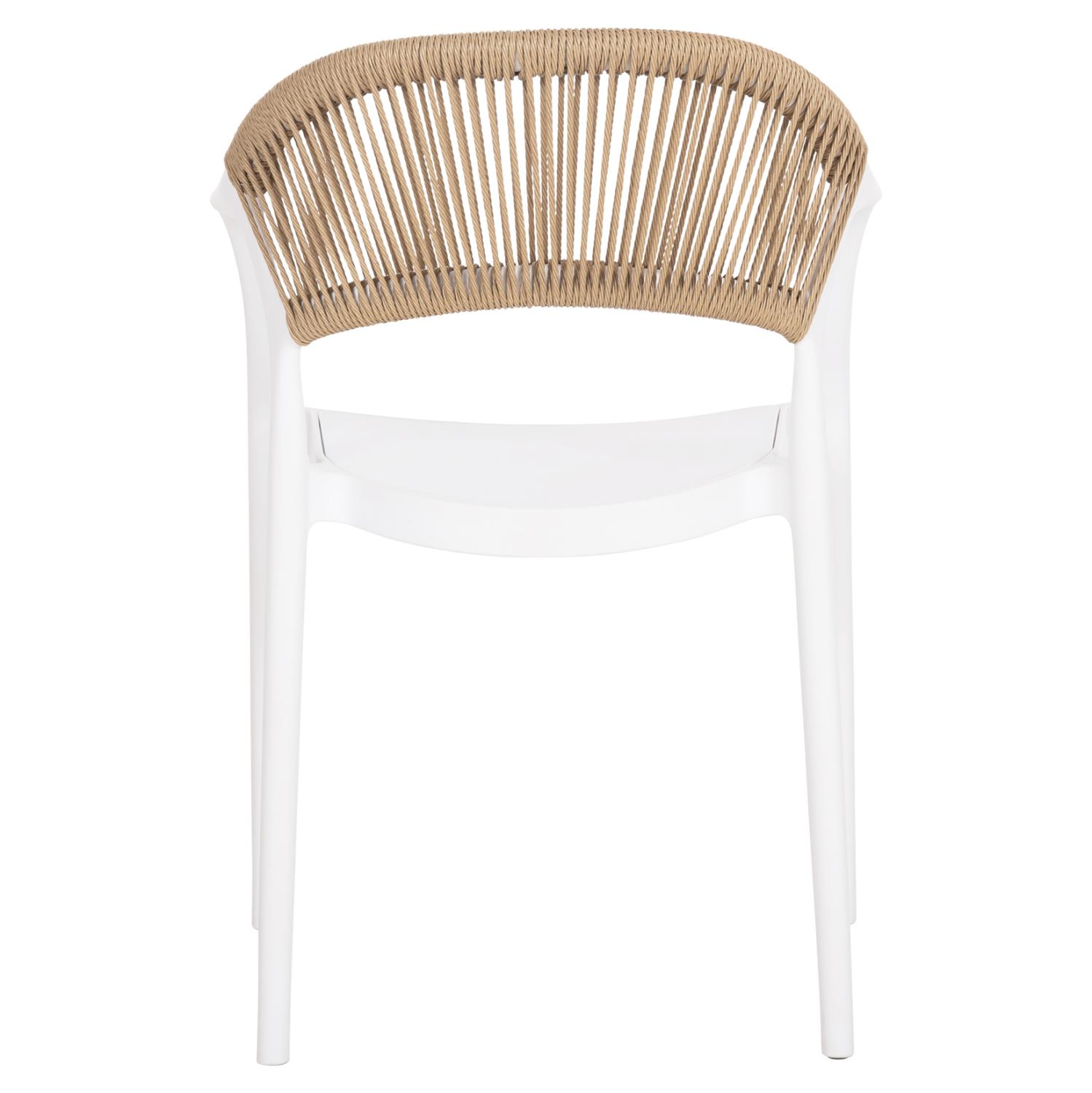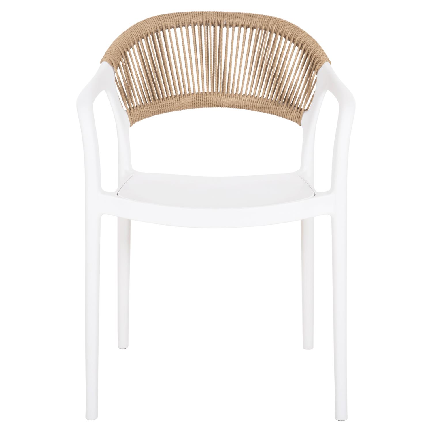 The “EVA” armchair has everything you would want from such a piece of furniture. The entire armchair is made of one-piece polypropylene in WHITE color with a slightly curved back upholstered in synthetic (p.p.) rope in BEIGE color, and practical arms. The whole construction is light and comfortable, and it will become the favorite seat in any space thanks to its practicality. Ideal choice, also, for professional use, such as in catering, etc., because it is stackable.