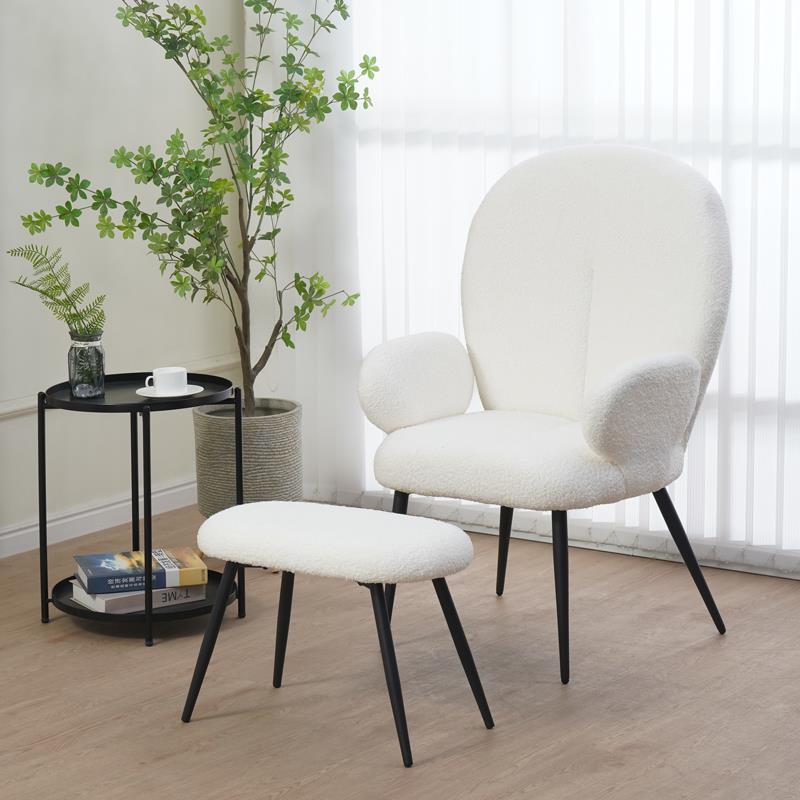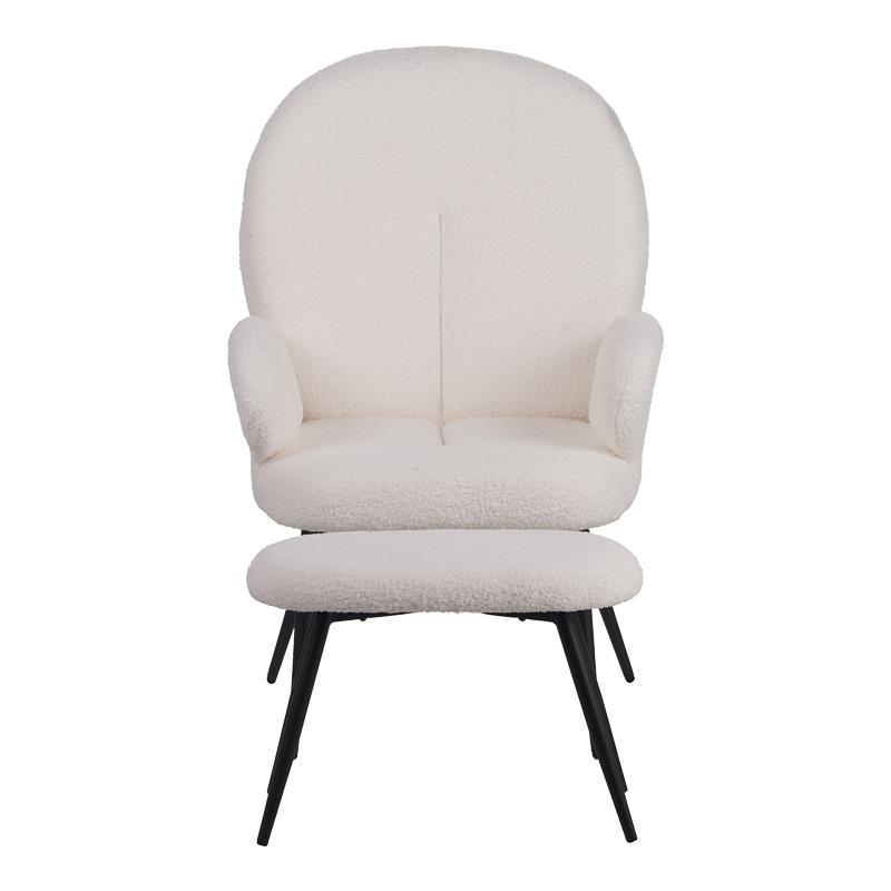 Πολυθρόνα Qarar με υποπόδιο μπουκλέ ύφασμα σε λευκή απόχρωση με μαύρα μεταλλικά πόδια 67.5x67.5x106εκ