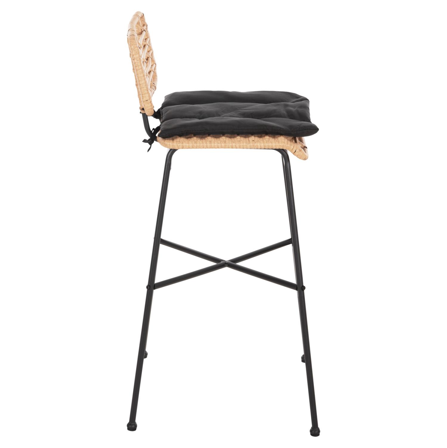 The ALLEGRA outdoor bar stool with a high seat is sturdy and beautiful! Its construction with Wicker synthetic Rattan in BEIGE color will aesthetically upgrade the space you put it and will catch the eye. It has a backrest and a black seat cushion that is attached to the chair with ropes, complementing it perfectly. The frame is metallic in BLACK color. The characteristic of this stool is that its backrest does not touch the seat and it is short.