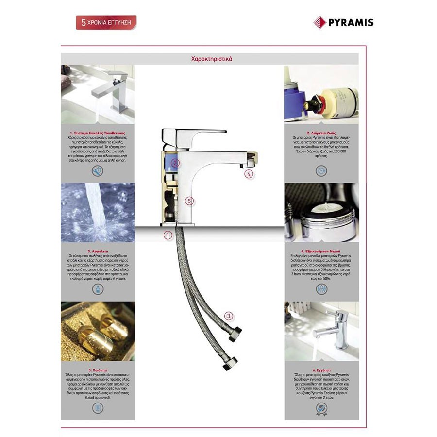 The PYRAMIS bathroom faucets combine the elegance of a simple and unnecessary design with the high quality of construction. They have premium Kerox mechanisms, air force filters with a flow regulator for water and air mixing and maximum water saving and are manufactured using epoxy paint with a thickness greater than 20 microns and resistance to a salt spray spray test of over 300 hours.