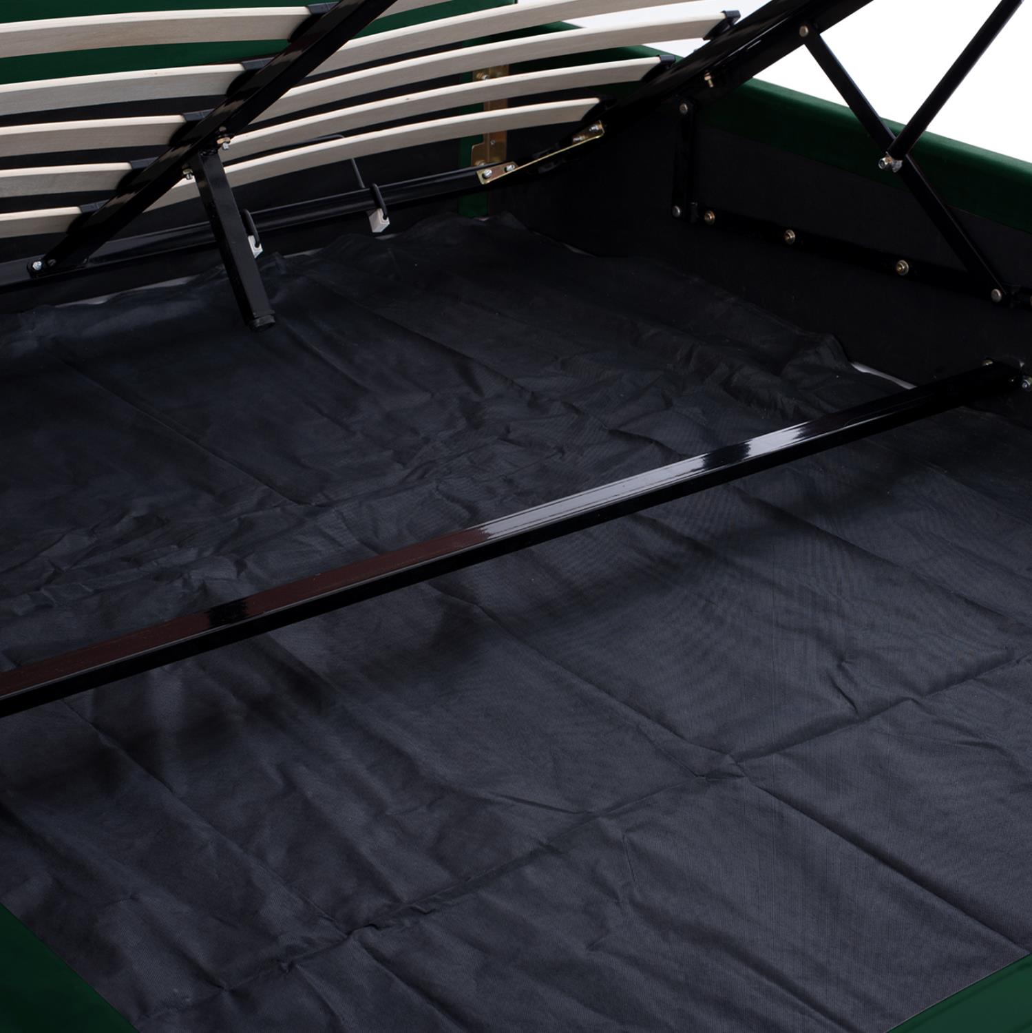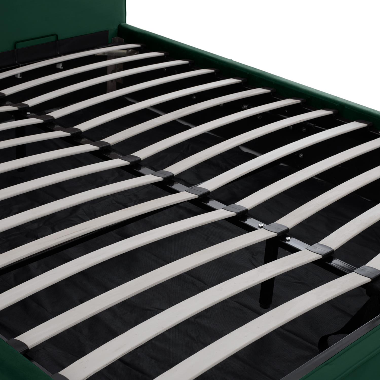 The mechanism of the storage space is metallic and is lifted by a strap. The mattress boards are also placed on this metal frame.