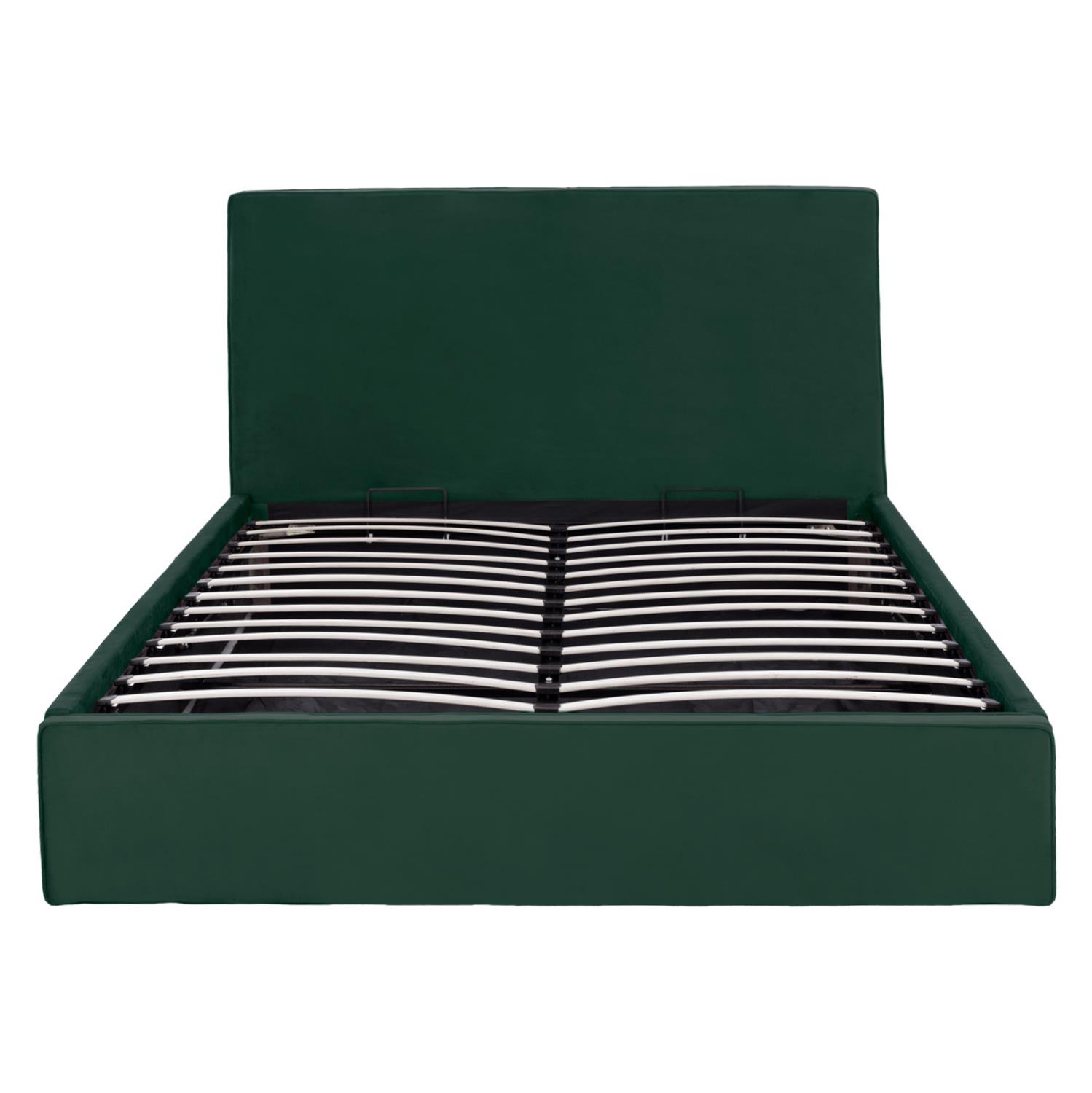 Therefore, we offer you the ALLIE bed so that you can enjoy every moment of your sleep. Dimensioned for a mattress of 160x200 cm, it is sufficient to accommodate two people. It has a high headboard with velvety upholstery in green color while a rail in the same color runs along all the edges of the bed. The mattress "sits" on two rows of anatomical boards, following the traditional way of making a bed. However, the main feature of this bed is that it has storage space under the mattress boards which “rest” on a metal mechanism, which is lifted by a strap. A modern and simple proposal that will renew your bedroom.