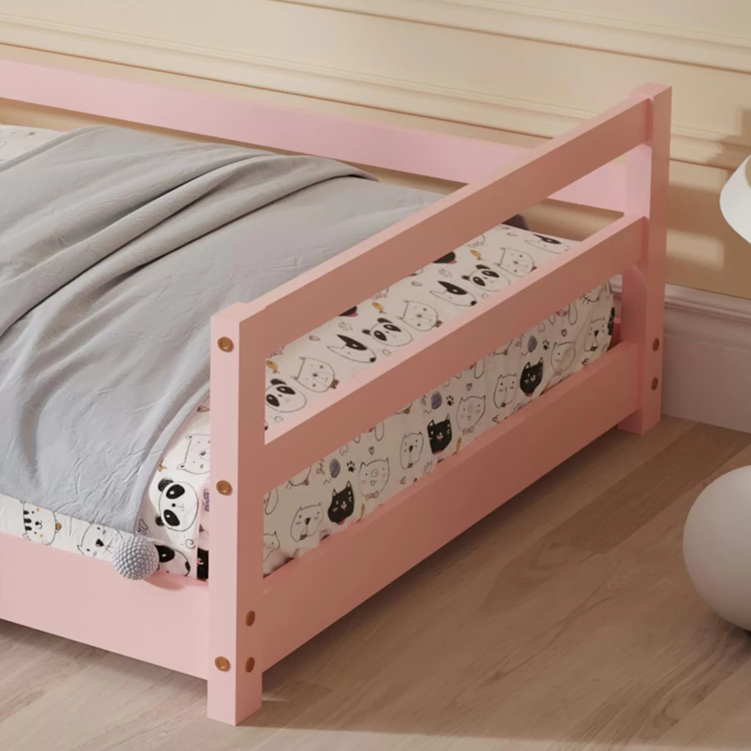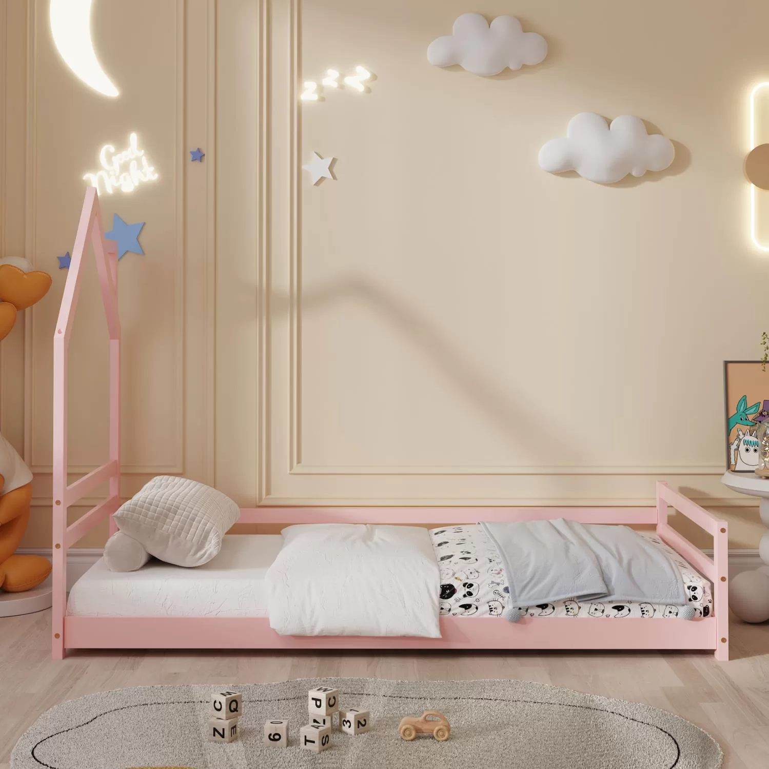 Introducing the new children's bed HOUSER. It is in dimensions for a single mattress 90x190 cm, and is an excellent quality, classic and safe choice for the children's room, since it is designed according to the Montessori educational system, according to which children learn best, when they choose for themselves what to do. The low bed height without legs helps them explore their autonomy and get in and out of bed freely at any time. It is wooden in PINK color painted with harmless water-based varnish and non-toxic, ideal for children. The mattress is placed on boards (slats) made of plywood. The headboard is in the shape of a house with a chimney that will give a pleasant, "warm", and playful look to any children's room.