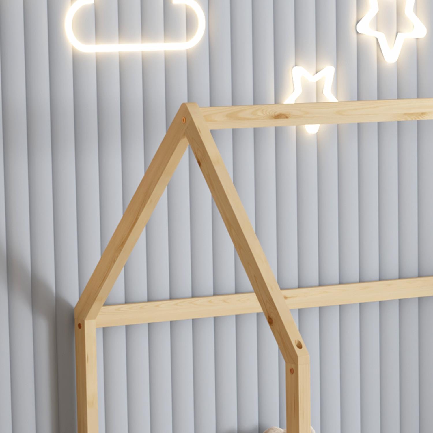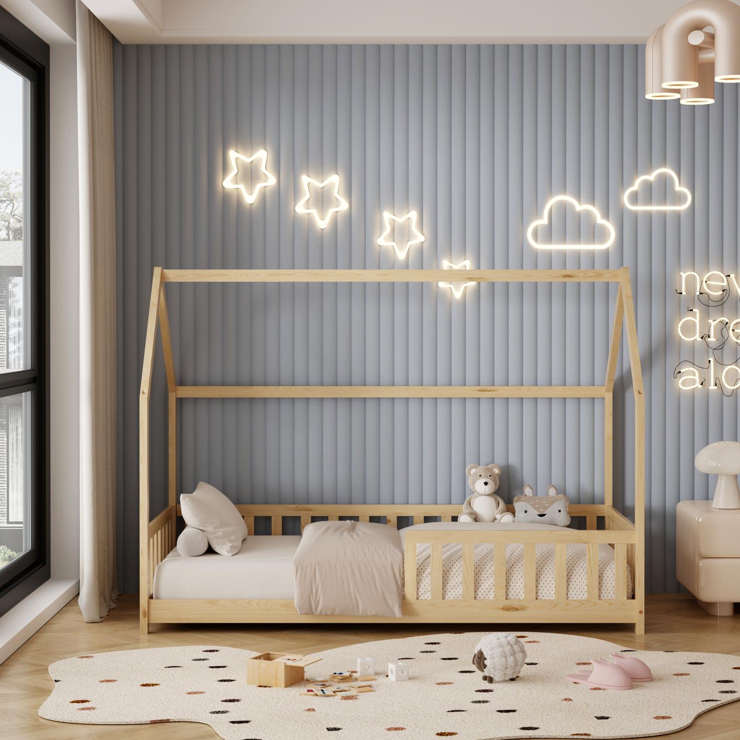 Introducing the new PHYLLIS Montessori-style children's bed, which means that it is designed according to the Montessori educational system, according to which children learn best, when they choose for themselves what to do. The low bed height without legs helps them explore their autonomy and get in and out of bed freely at any time. It is in dimensions for a single mattress 90x190 cm, and is an excellent quality, modern and safe choice for the children's room since it has a wooden railing around the perimeter. It is wooden in NATURAL color painted with harmless water-based varnish and non-toxic, ideal for children. The mattress is placed on boards made of plywood. The whole bed is in the shape of a house and quite high, which will give a pleasant, "warm", and playful look to any children's room.