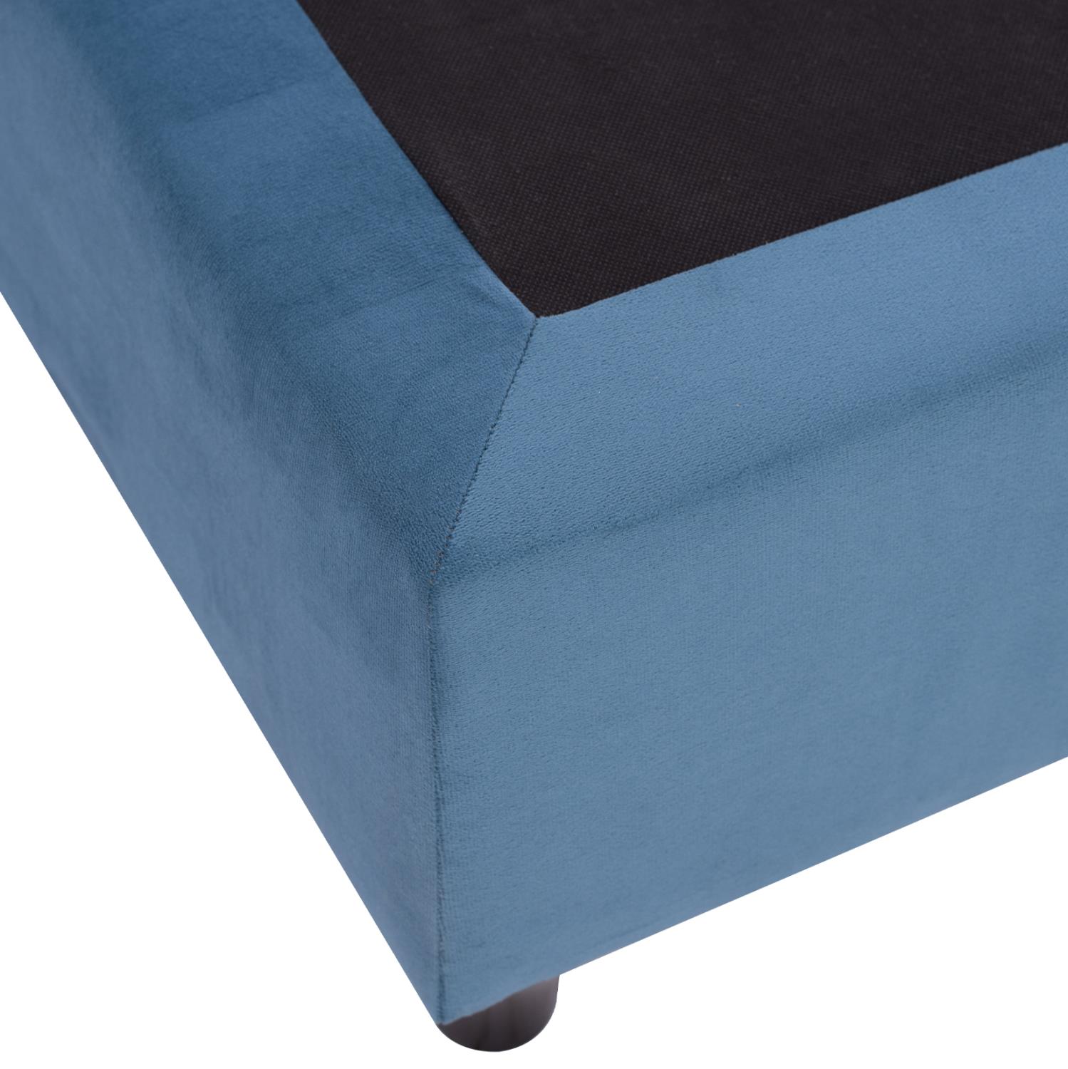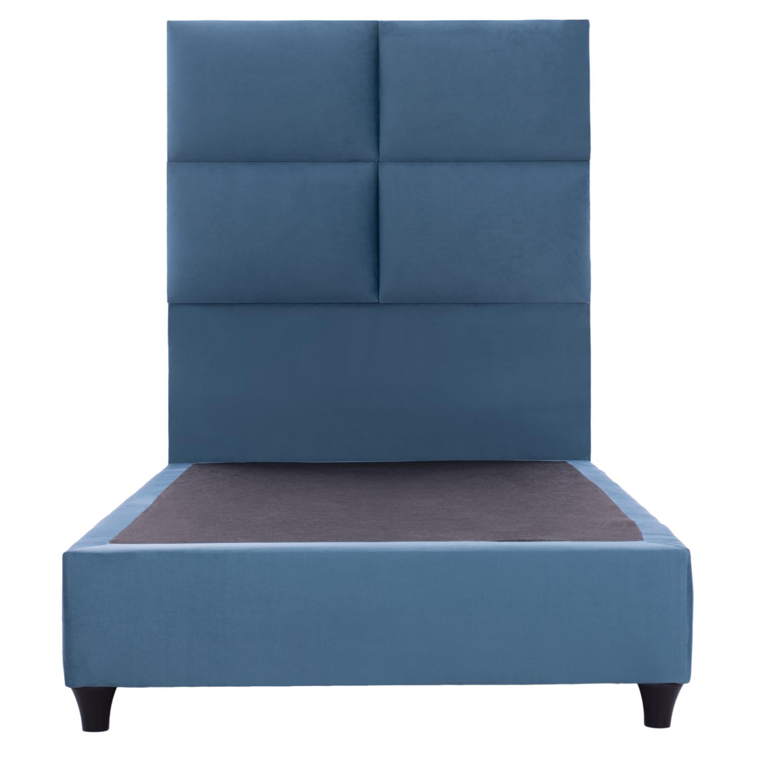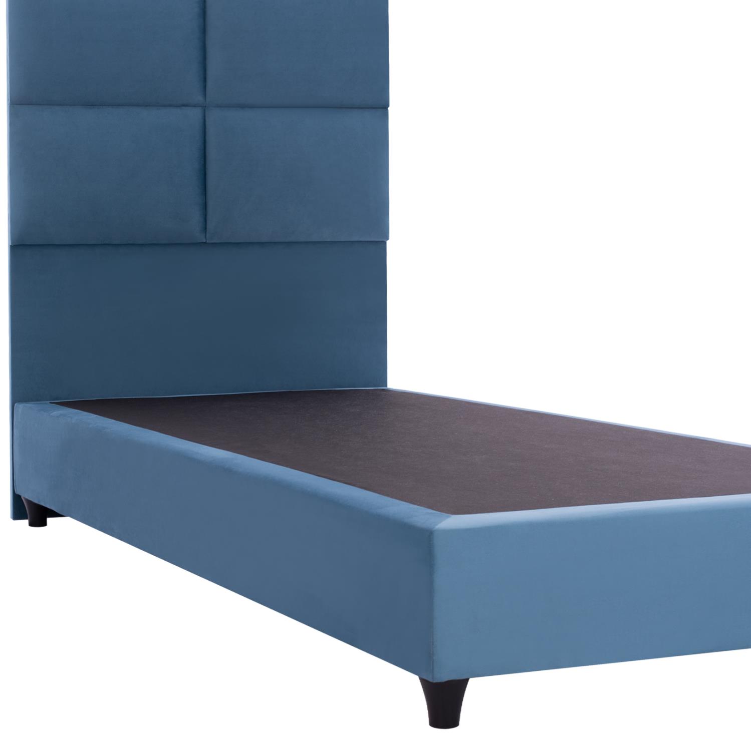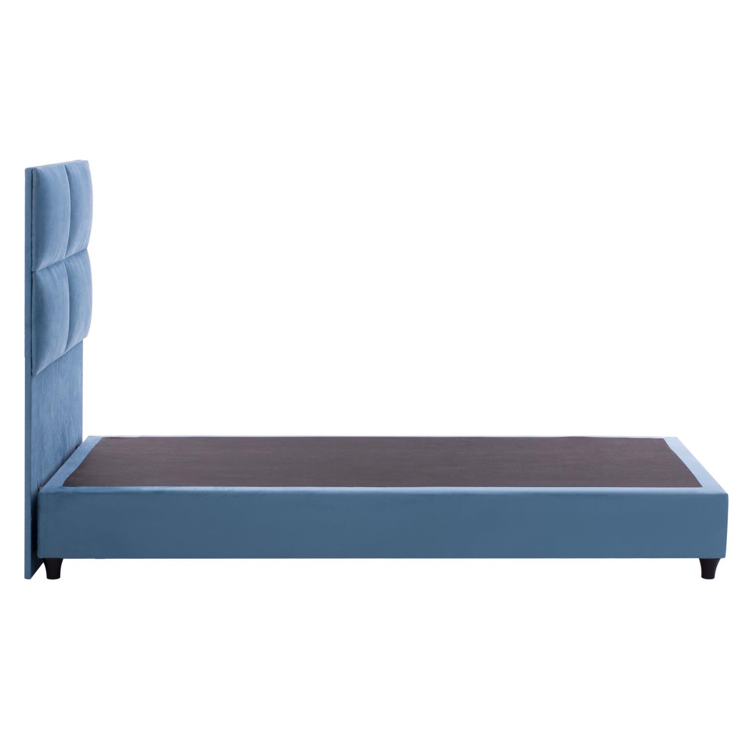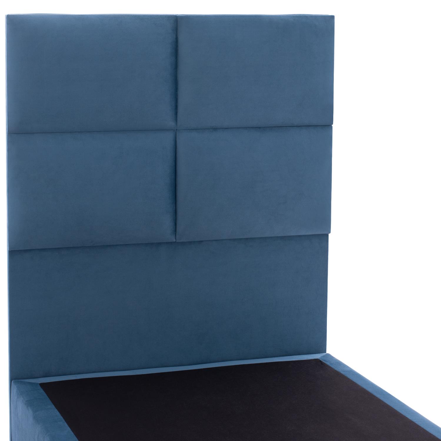 ΗΜ652.09-bed---The great ancient poet Homer said in the “Iliad” that sleep is the king of all. Both of men and of gods. We can certainly ensure you a “royal” sleep! With the MILO bed with its 3-YEAR WARRANTY ON THE FRAME you will never ask for anything else. The headboard is high and upholstered with a quilted pattern of large rectangles, while the entire bed is upholstered in velvety fabric. The BLUE color throughout the bed is striking and can be combined with a variety of decorative patterns. But the main feature of this bed is that it does not follow the classic construction with the slatted slats (bed boards) to support the mattress, but instead consists of a continuous surface of a chipboard on which the mattress rests! In single mattress dimensions of 90x200 cm.