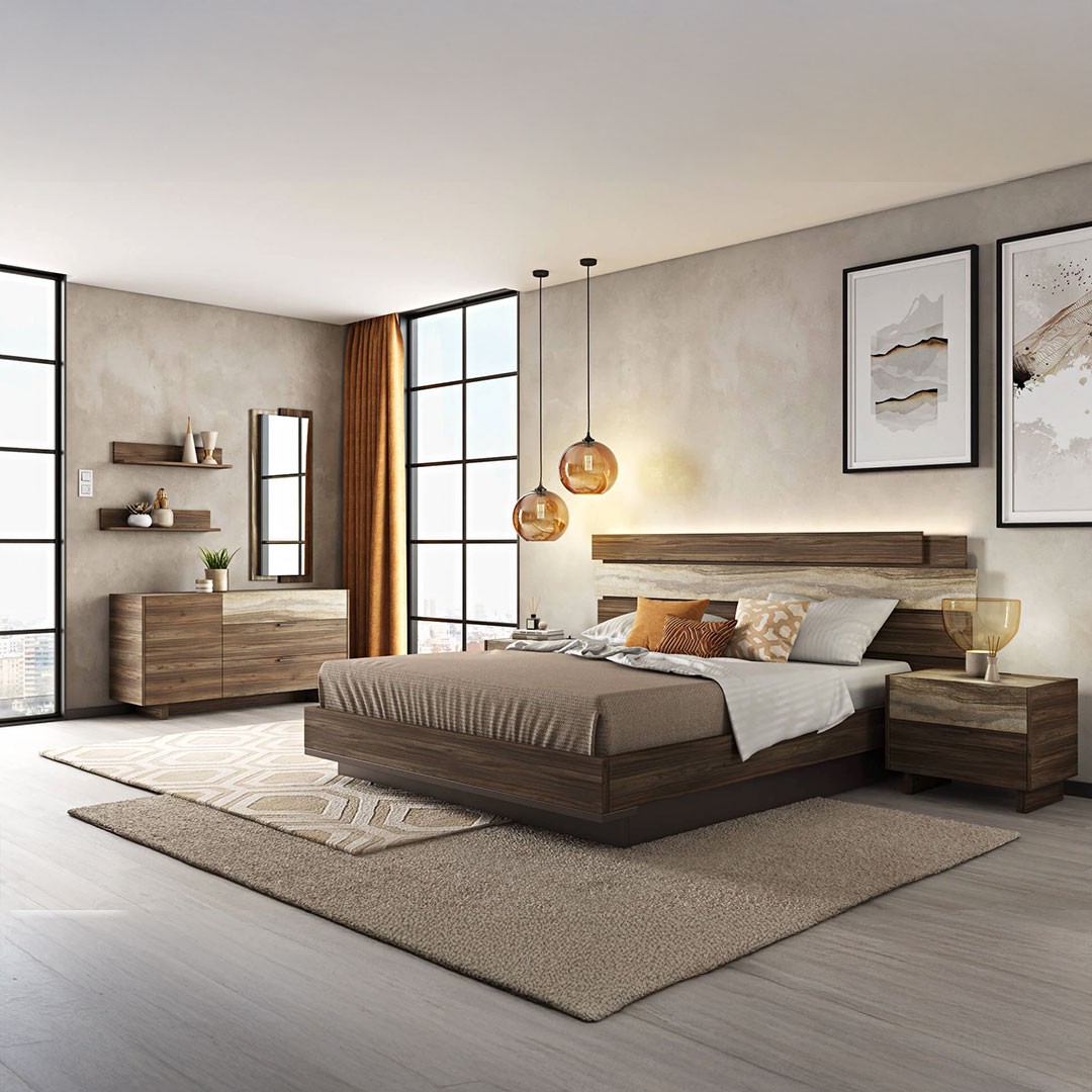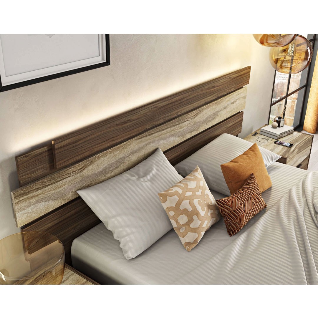 We present to you the SICILIA bed, which combines elegance and functionality, offering a modern and at the same time warm aesthetic in the bedroom. It features wooden coverings on the headboard, made of artificial veneer in tobacco walnut - walnut color, combined with a special embossed decorative surface that adds character and uniqueness to the construction.
