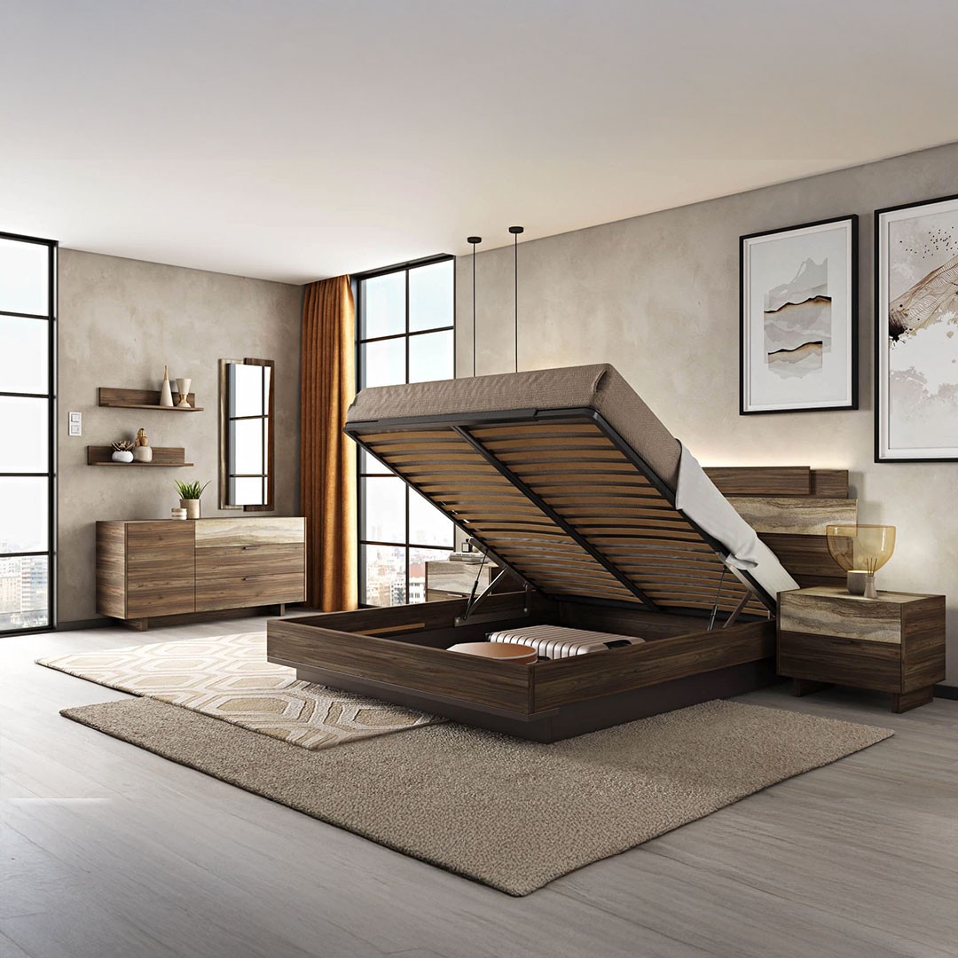 The SICILIA double bed can be supported either on wooden slats or on an anatomical frame, and is available with or without storage space and can be easily converted and a special lifting mechanism can be added, creating a large storage space, saving space in the bedroom.