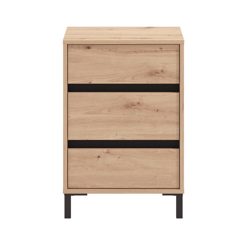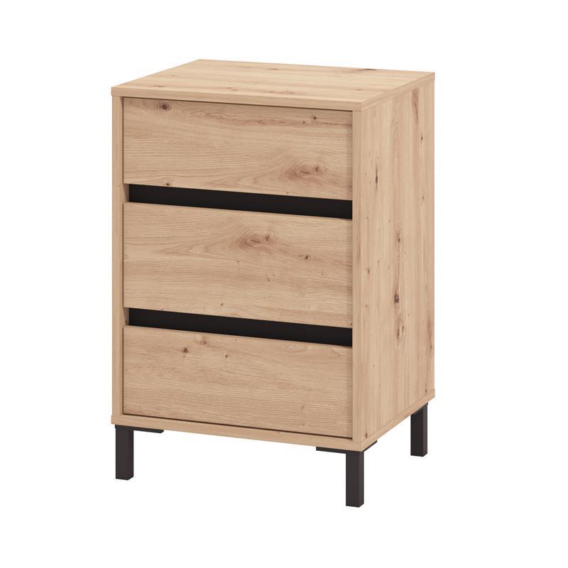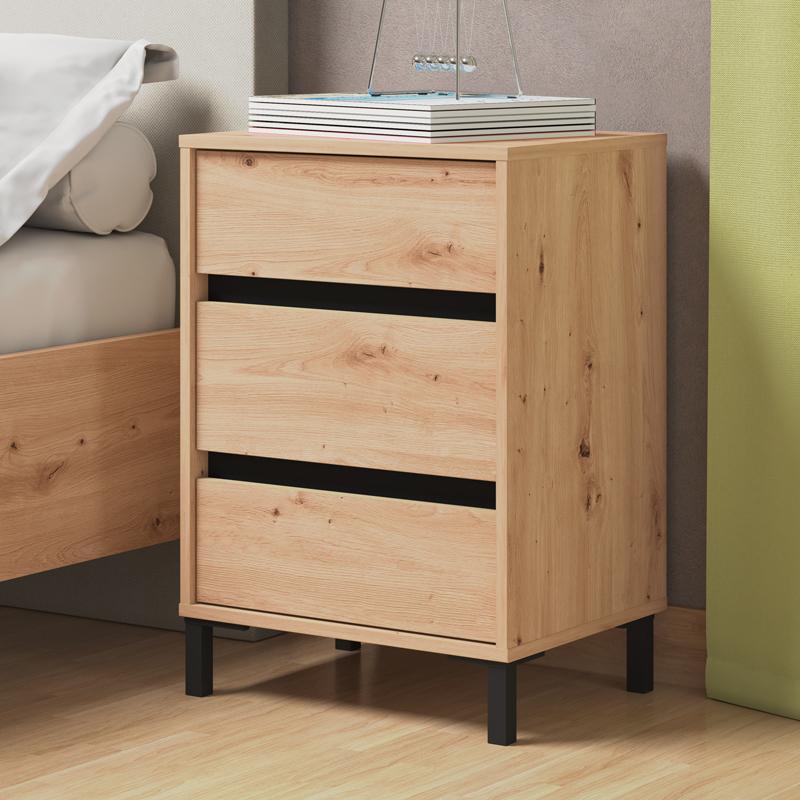 The Marron bedside table combines practicality and modern aesthetics. It features three storage drawers, offering plenty of space for organizing small items, such as books, accessories or personal belongings. The durable melamine material ensures long-term use and easy maintenance, while the elegant design of the bedside table makes it ideal for any space, such as the bedroom or living room. Its simple and modern design fits into various decoration styles, offering a practical and beautiful way to keep your space tidy. The bedside table features a 2D wrapped MDF profile, offering durability and elegance, while the melamine finish enhances its aesthetics and long-term use.