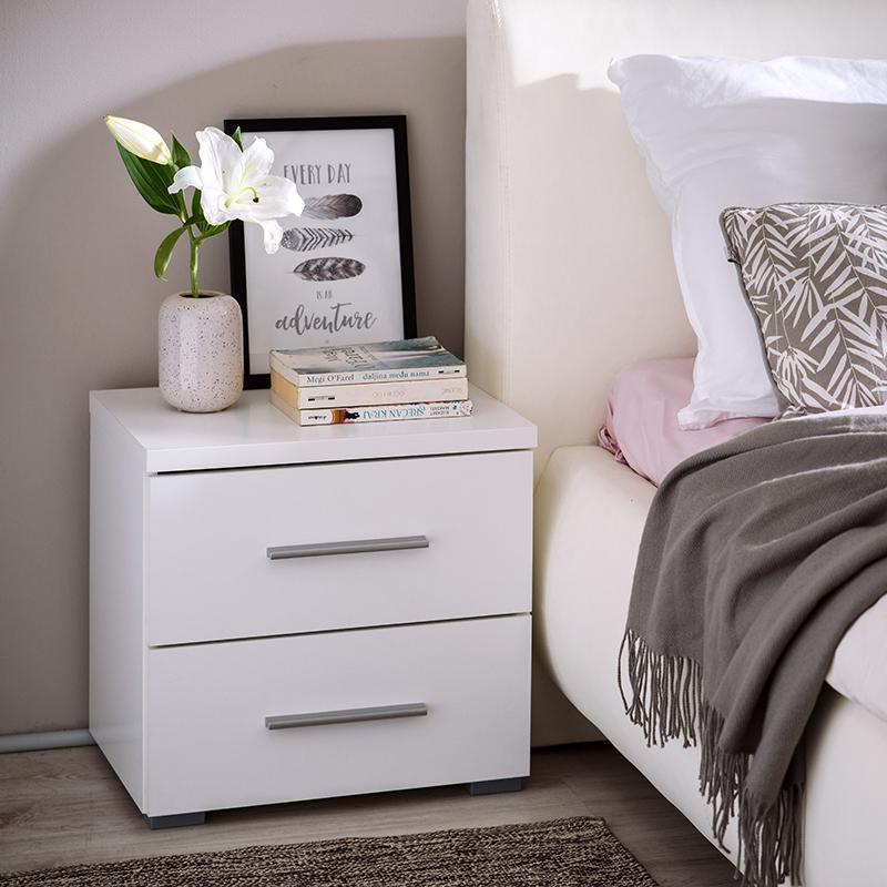 It features two spacious drawers, providing ample storage space for books, small items, or accessories. The plastic grey handles blend harmoniously with the nightstand, allowing for easy opening and closing of the drawers.