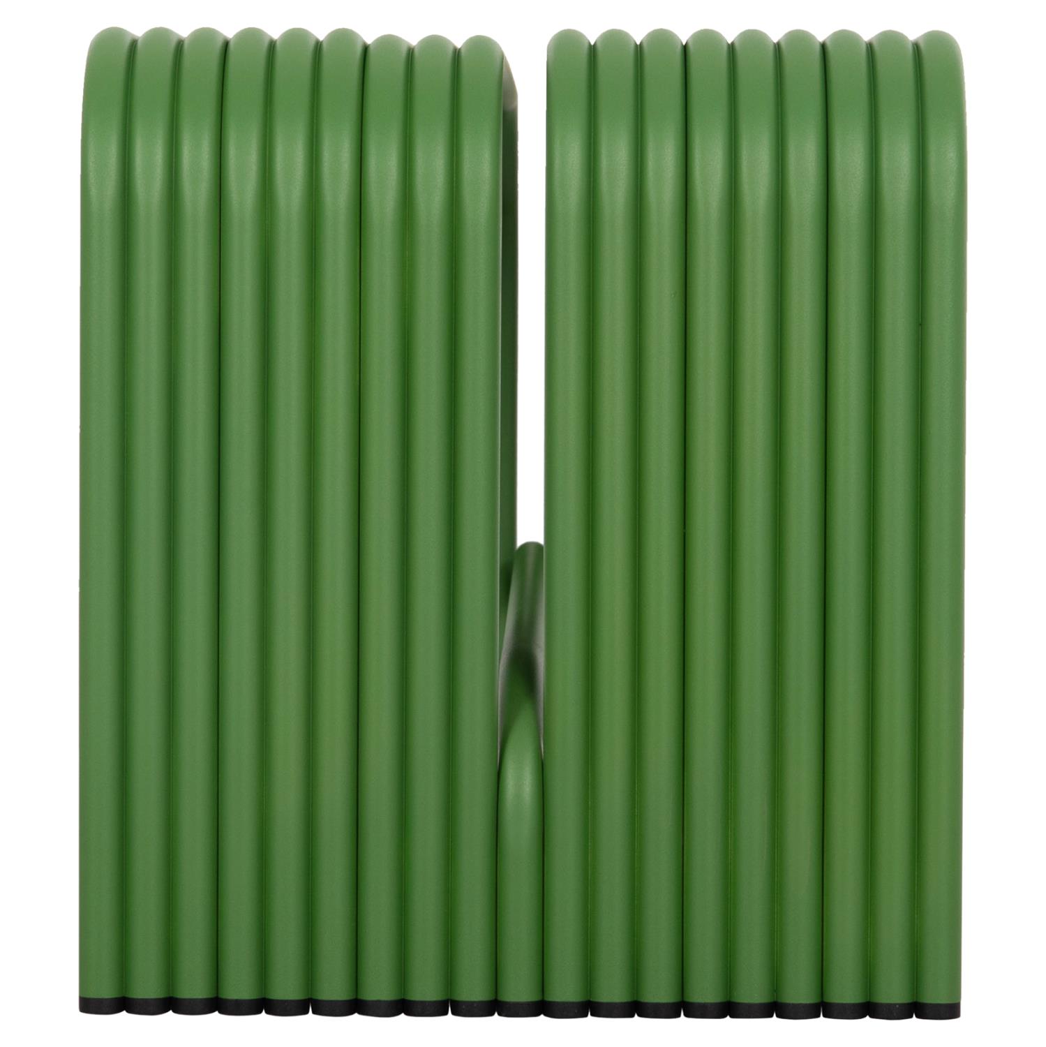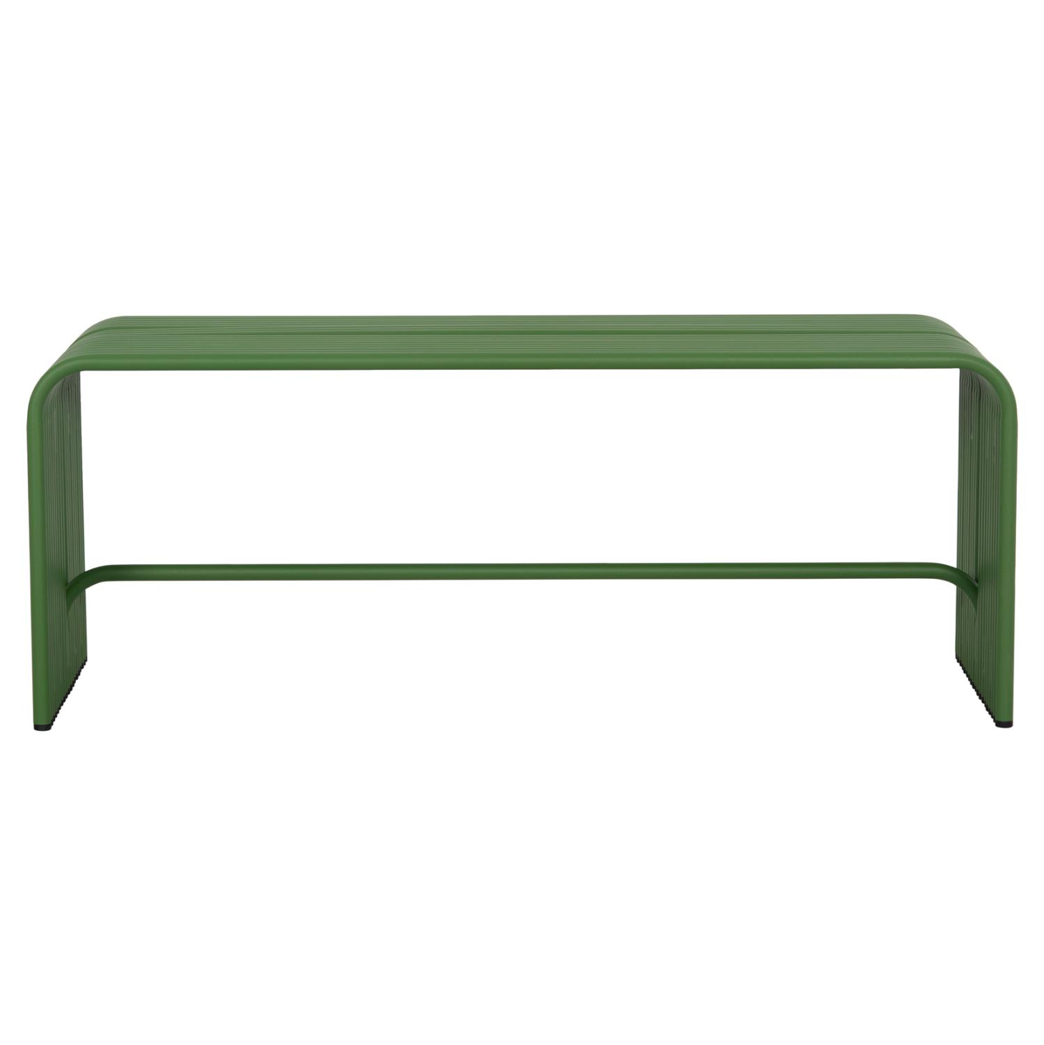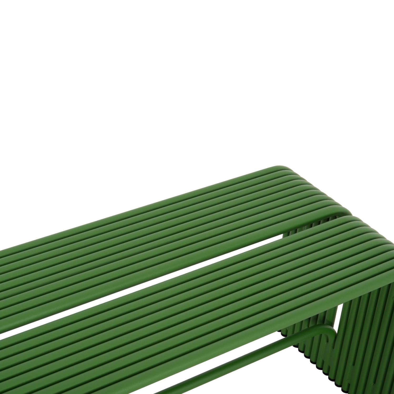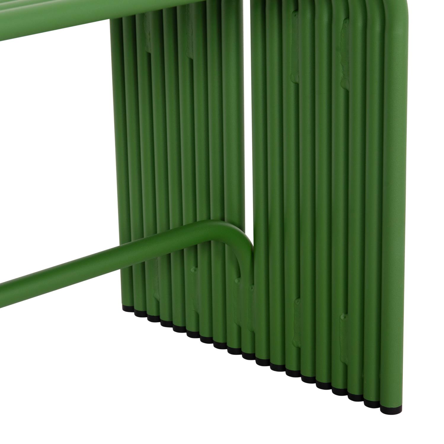 INTREPID is a practical low 2-seater bench made entirely of aluminum tubes in GREEN color, with plastic caps on the bottom of the legs. A useful and modern addition to any space!