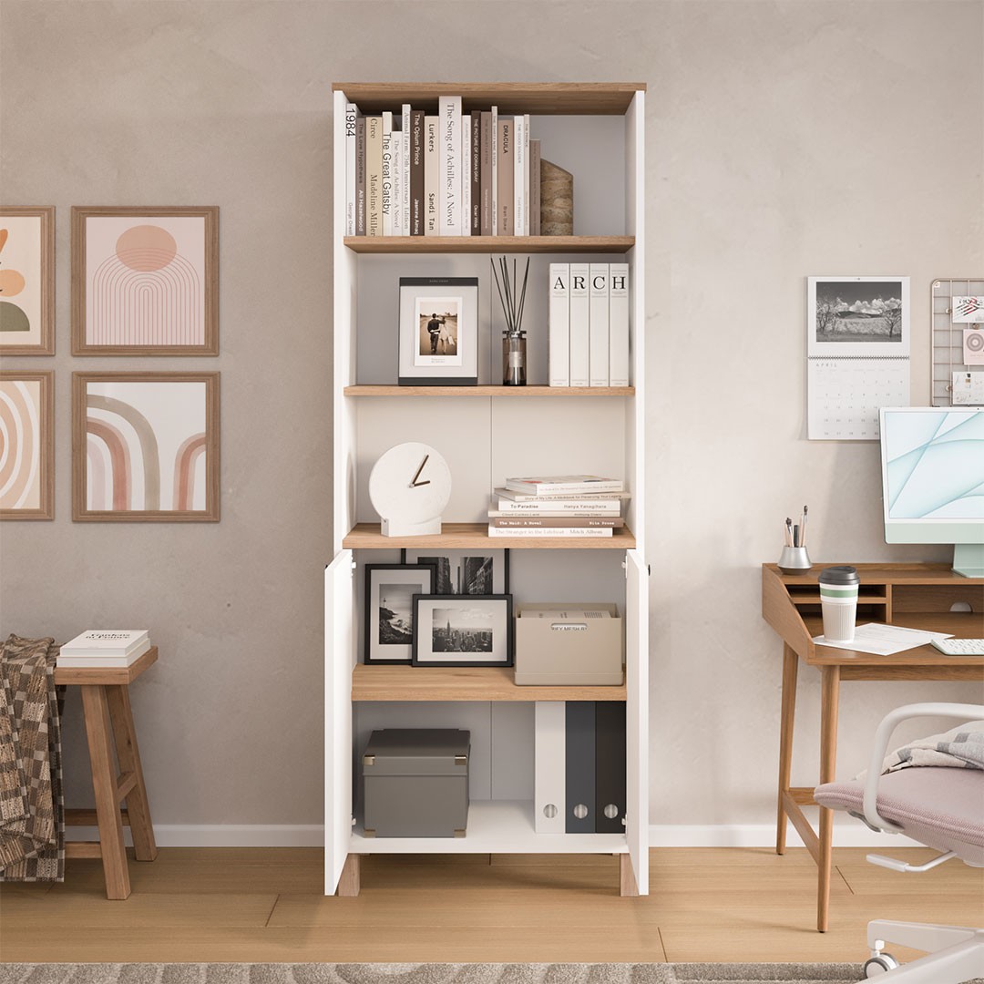 The NORD bookcase is an elegant and functional proposal for those who want to organize their space with an aesthetic inspired by Scandinavian design. The combination of white with natural oak creates a bright and warm effect that easily fits both in an office and a living room, while its clean lines give it a timeless character.