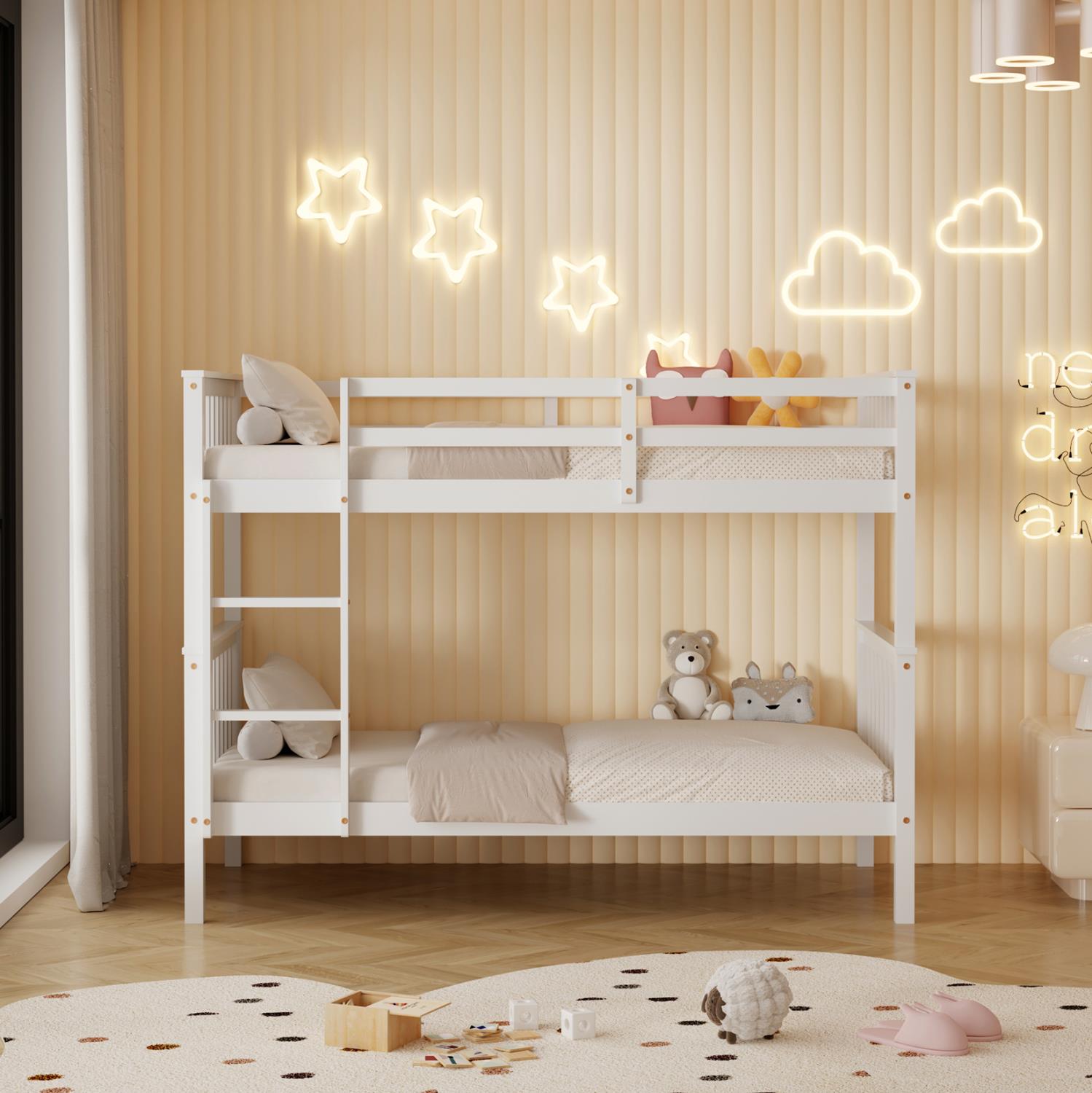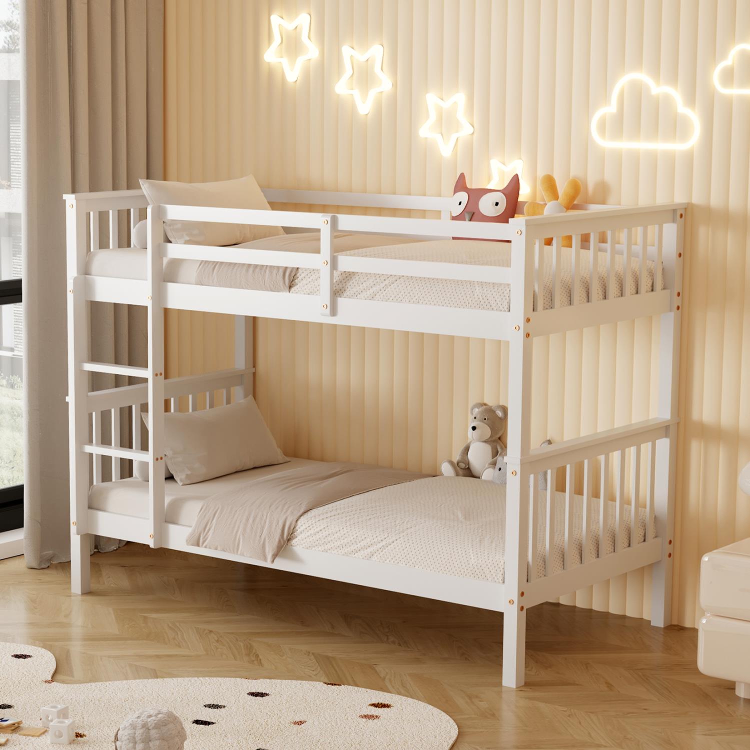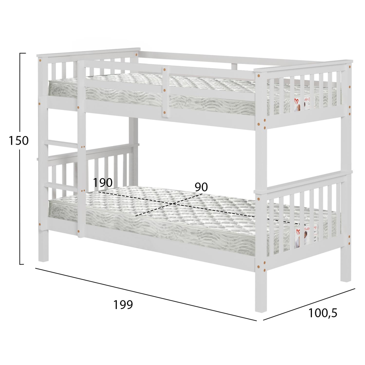The LANTAI children's bunk bed in a size for mattresses of 90x190cm, is made of pine wood in WHITE color. The bunk bed with relatively high legs has perimeter railings and a built-in ladder to access the upper bed, while the mattresses are placed on plywood boards.