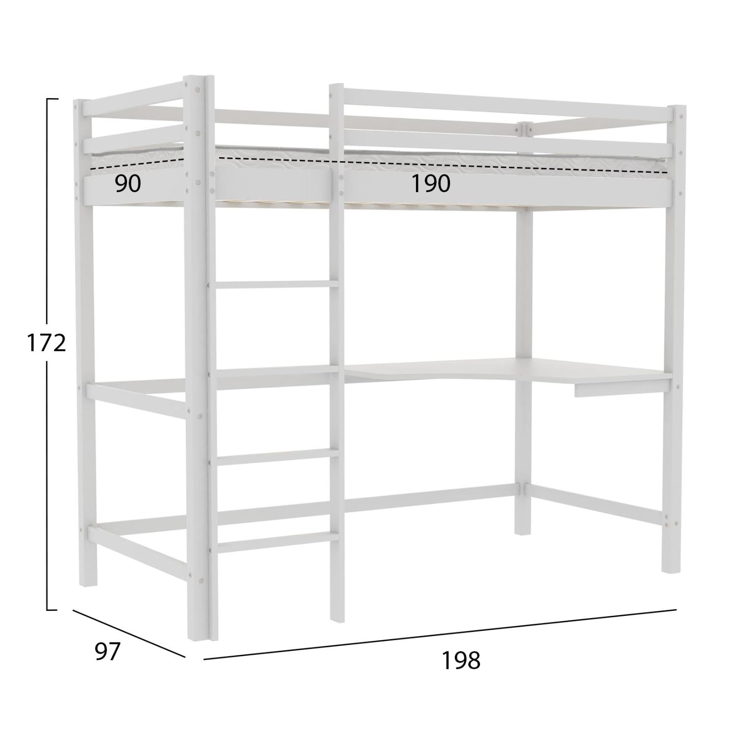 The AKRON children's bunk bed in a size for mattresses of 90x190cm, is made of pine wood in WHITE color. The bunk bed has perimeter railings and a ladder to access the upper bed, and a corner desk at the bottom, while the mattress is placed on plywood boards.