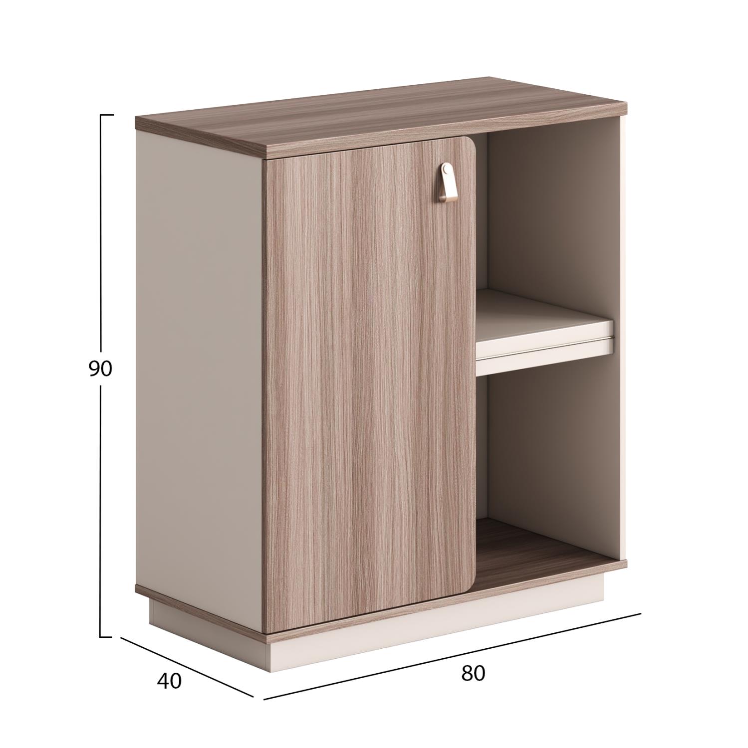 The left side has a cabinet, while the right side consists of an open bookcase-type storage space with 1 shelf, offering immediate access and flexibility in use.