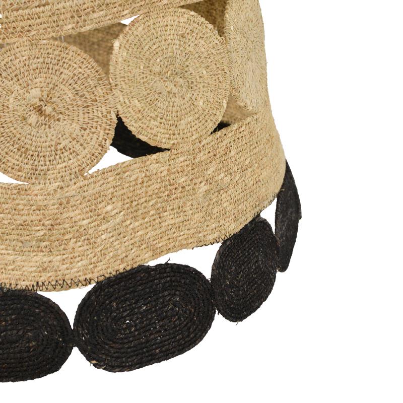 * Metal and jute construction. Jute is one of the most affordable natural fibers and second only to cotton in the quantity produced and variety of its usability. Jute fibers are mainly composed of plant materials cellulose and lignin. Jute is also called "golden fiber" for its color and great durability.