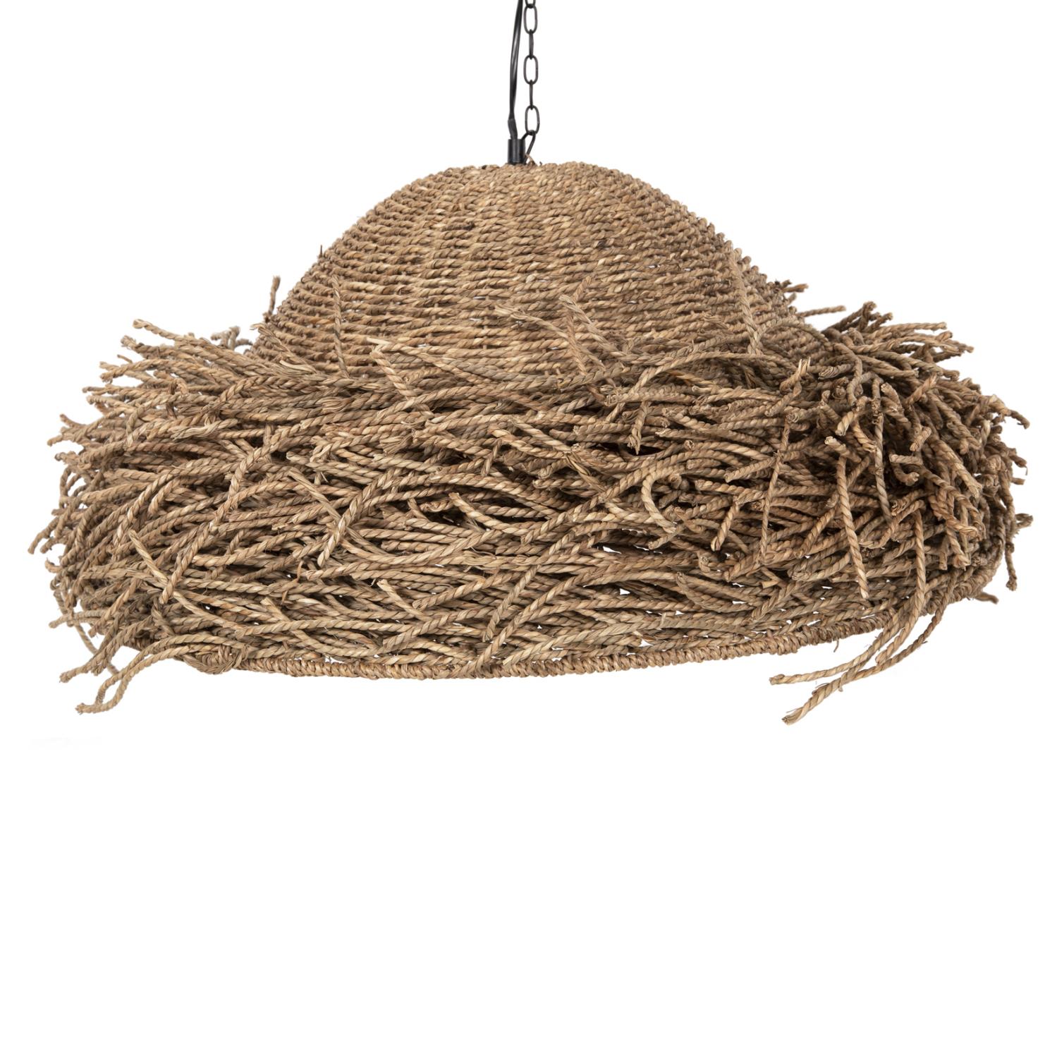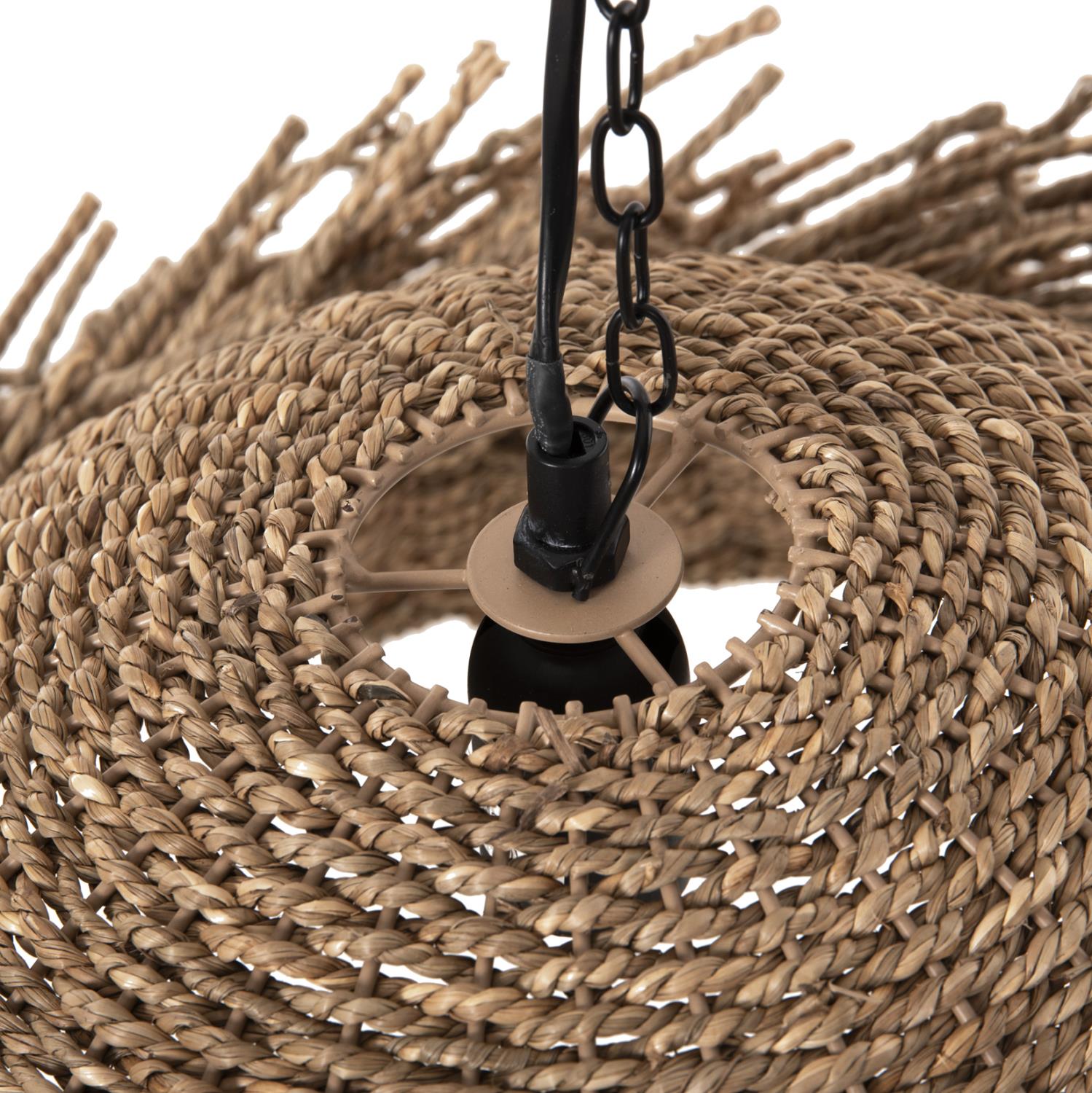 If you wish to decorate your space with a lamp in boho style, this lamp which is one of the new additions to our range is a safe choice. It is a single-light lamp with a bell-shaped cap made of dried seagrass, in natural color and it has fringes at the perimeter of the cap.