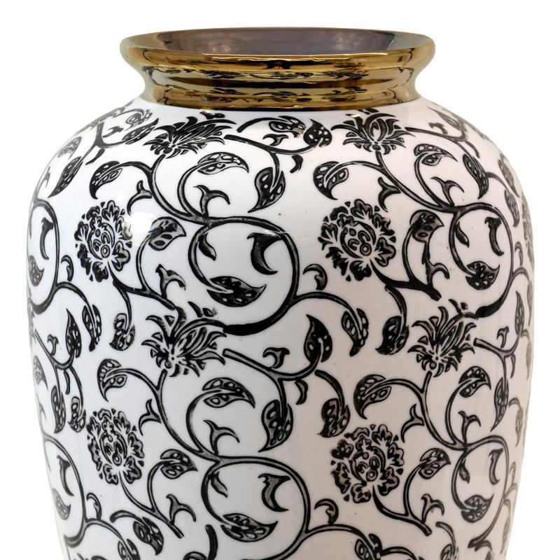 Accent your space with this ceramic round vase FL22908 in a striking color palette of black, white and gold. Its sleek, spherical design exudes a modern aesthetic with a touch of luxury, making it the perfect accent for your living room, office, entryway or dining room.