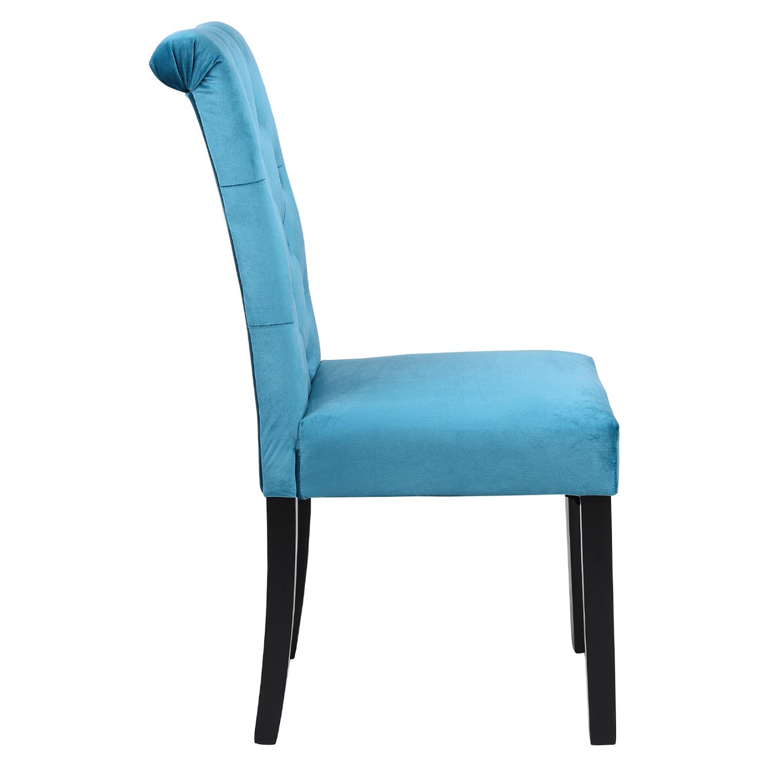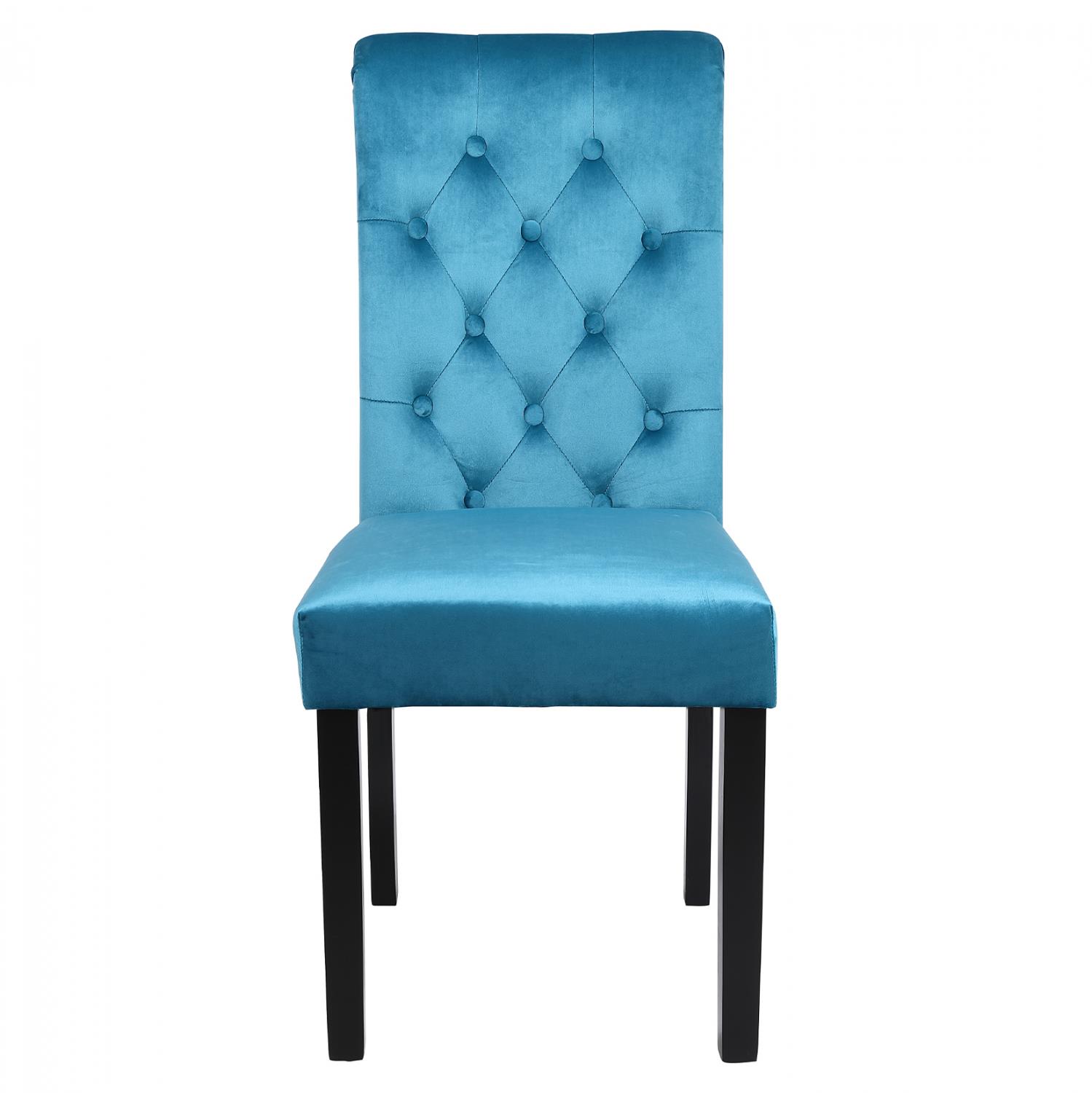 The dining chairs feature soft velvet upholstery in a turquoise shade, and offer a comfortable seat to enjoy a meal or just relax.