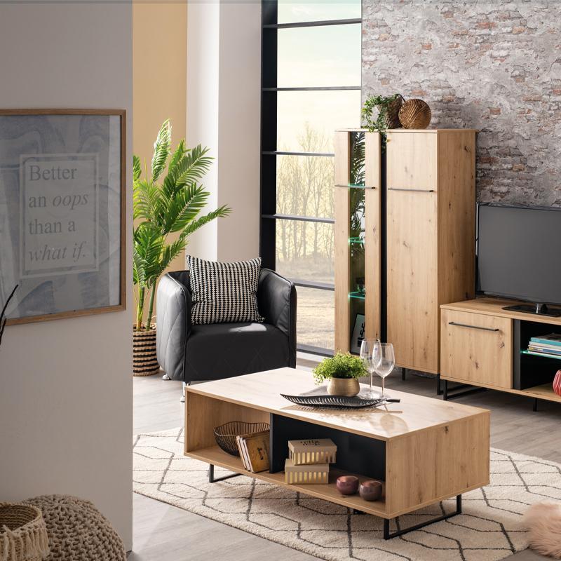 The Sardinia lounge table in artisan oak/black combines the natural beauty of Artisan Oak with the refined black detail, creating a timeless and elegant piece of decoration. Its appearance brings to the forefront the authenticity of the wood, while the black details give a contemporary element that fits perfectly into any modern or classic lounge.