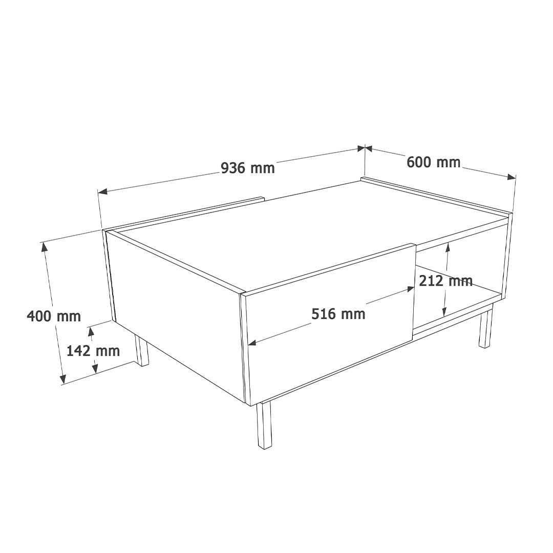 Made of 18 mm melamine, it offers robustness and durability in daily use, while maintaining a neat and quality appearance. In terms of functionality, it has an open storage space, ideal for magazines, books or everyday objects, as well as a large drawer that offers additional storage, keeping the surface tidy. The drawer is equipped with high-quality mechanisms, with a full extension function for full access to its interior, as well as a secure locking system to prevent knocks from small children, offering comfort and safety in everyday life.