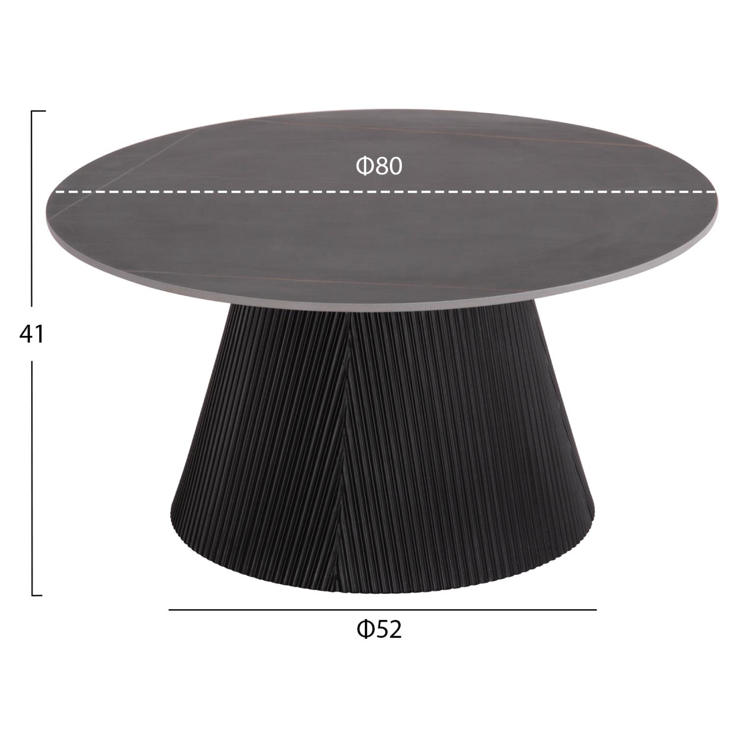 The set of 2 round coffee tables “DUNCAN” consists of a relatively low table with a ceramic top in BLACK MARBLE color mounted on mdf panels, with a conical base made entirely of mdf, with beautiful pleats, and a slightly taller table with a top made of MDF in NATURAL WOOD color mounted on a metal tray with a raised perimeter, also with a conical base with folds. The set combines practicality with discreet luxury and can upgrade any living room.