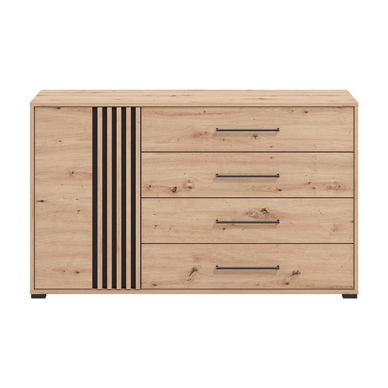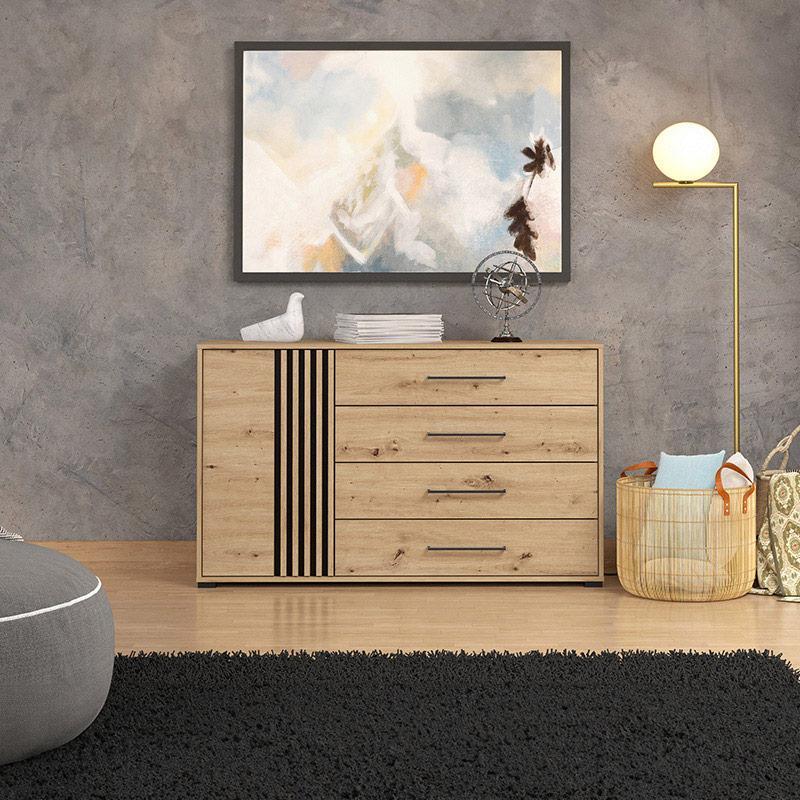 The Ascalon dresser from the eponymous collection combines excellent aesthetics and absolute functionality, offering an ideal storage solution for any space in the home. It features a cabinet with two shelves and four spacious drawers, ideal for organizing personal items, clothes, or accessories. The classic color scheme in artisan oak and black combines the purity of white with the elegance of black, creating a timeless and sophisticated look.