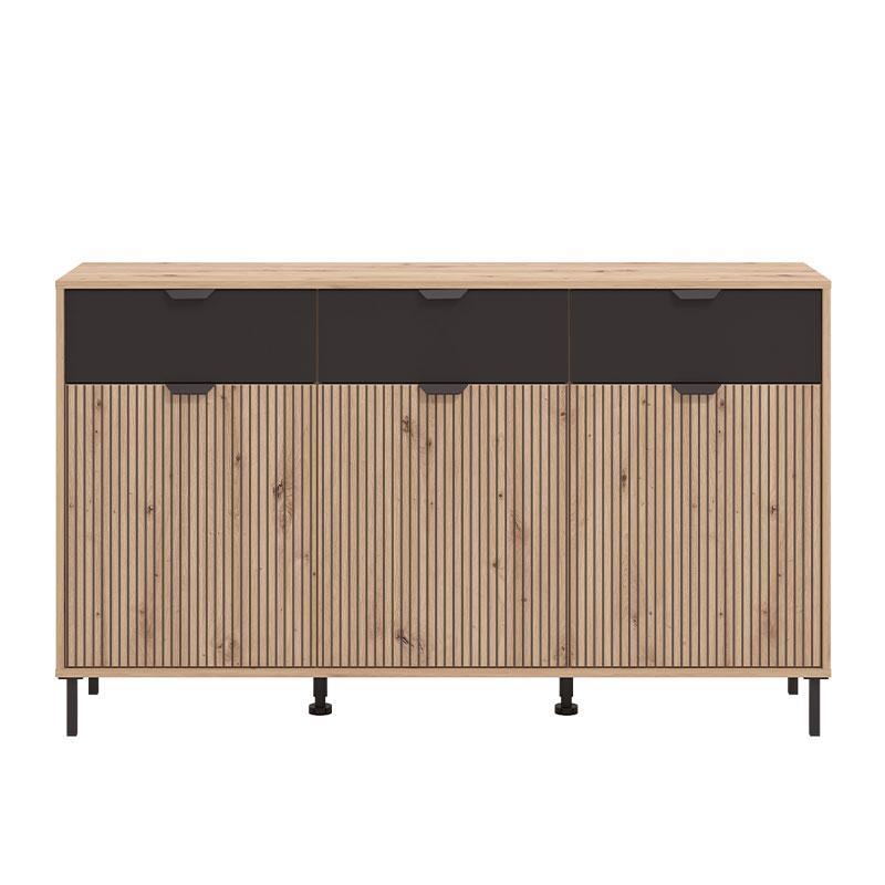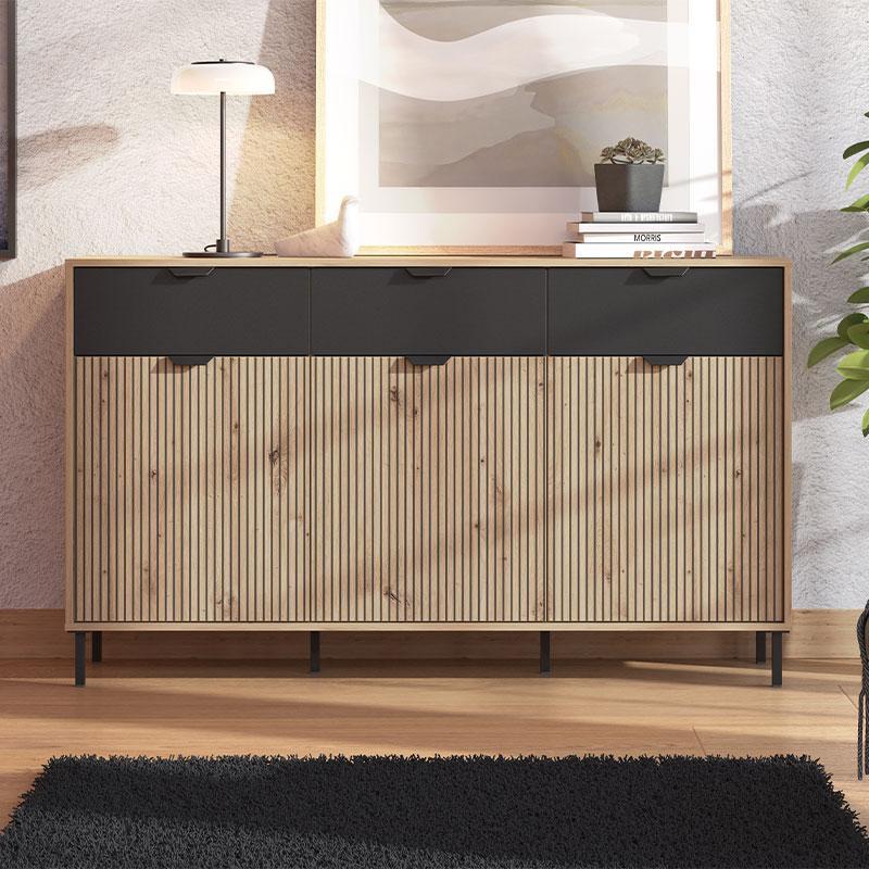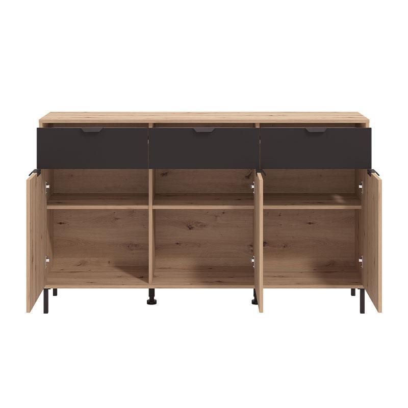 The dresser features three spacious cabinets and three drawers to organize your personal belongings with easy access. The combination of the Artisan oak and matte black color, along with the discreet black lines, creates a strong aesthetic contrast that adds character to the space. The matte black metal handle offers an additional touch of sophisticated modern aesthetics.
