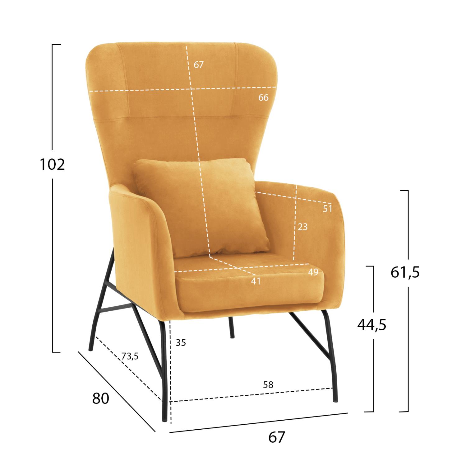 We present you the DANIA bergere, in a peculiar GOLDEN color with black metal legs. The lining of the entire bergere has been made with shiny velvet while the extra waist pillow is covered with the same fabric. It is a simple but at the same time imposing structure that will be the center of interest in any living room.