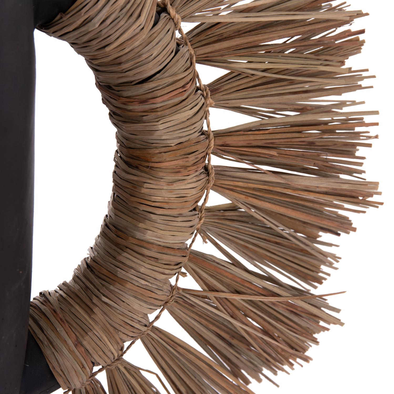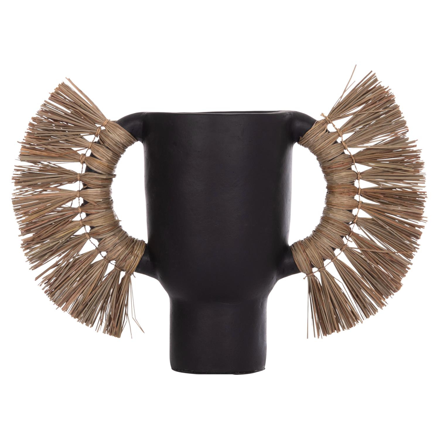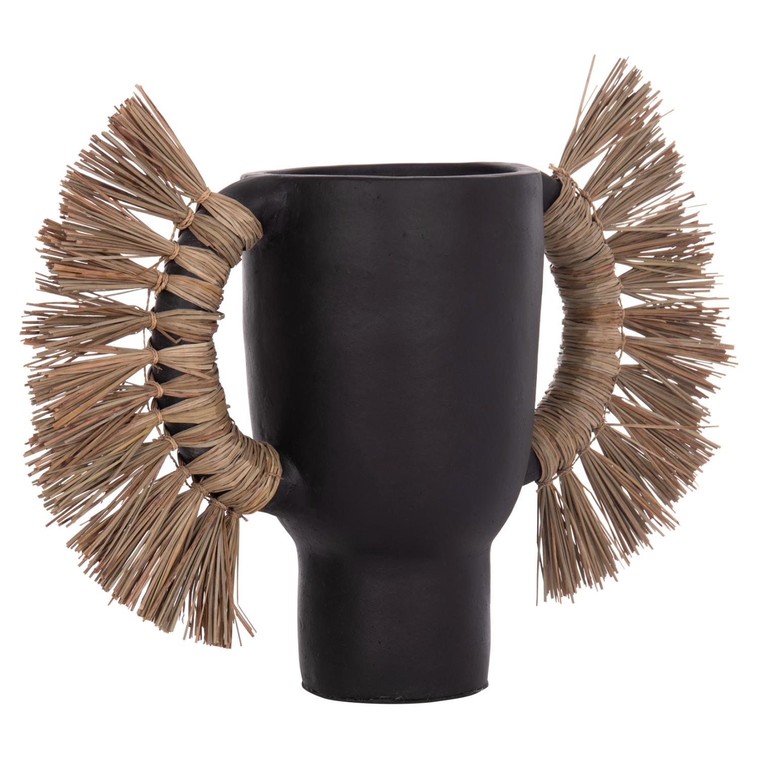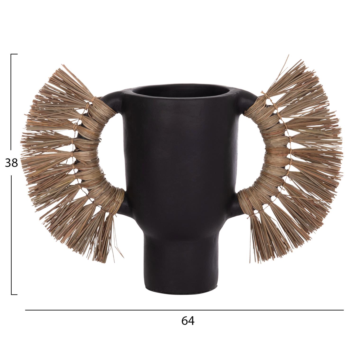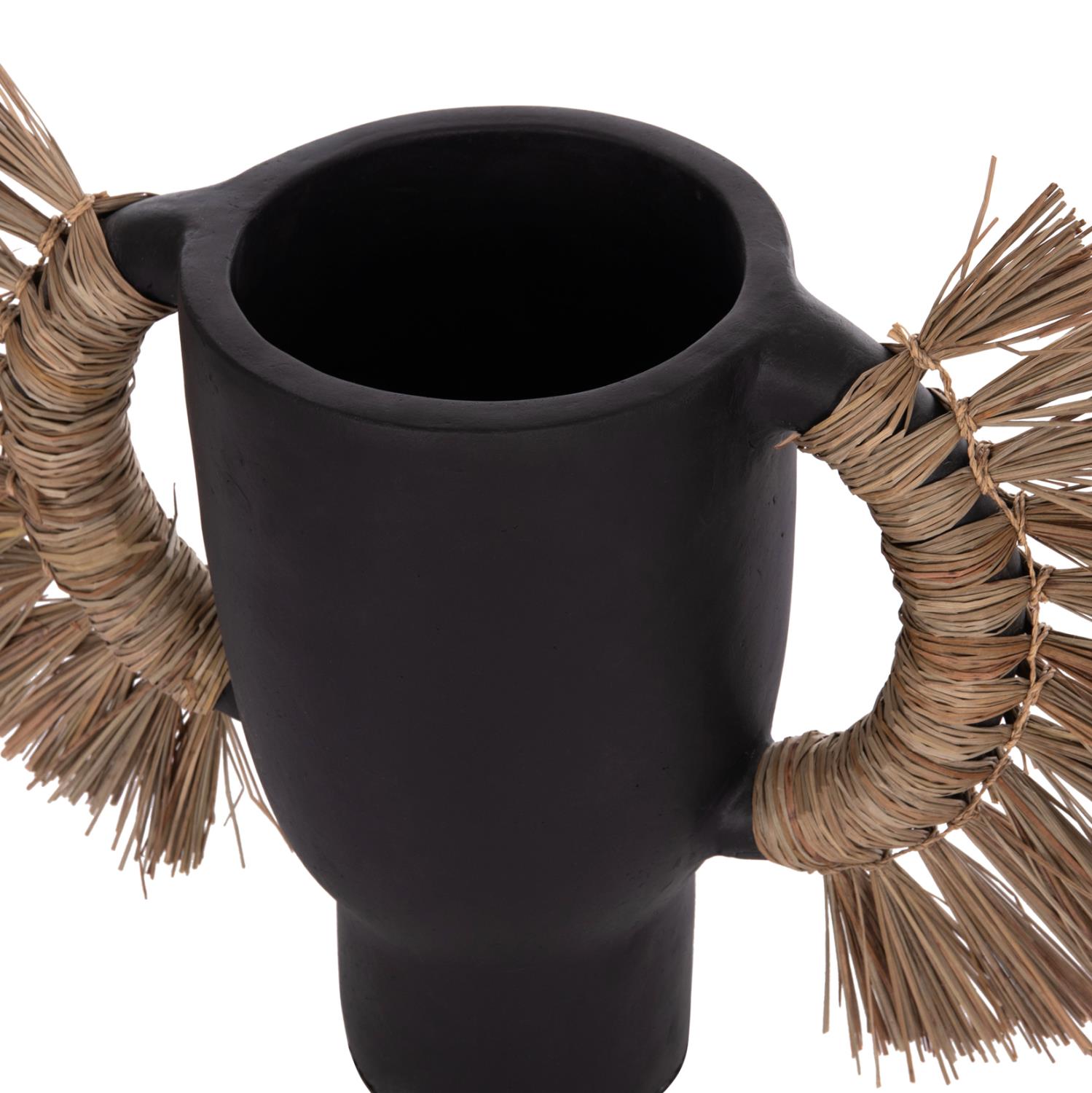 The ALICA handmade table decorative vase is a very special decorative element for any space. It is made entirely of terracotta in BLACK color, and features two handles covered with dried grass, and a wide rim.