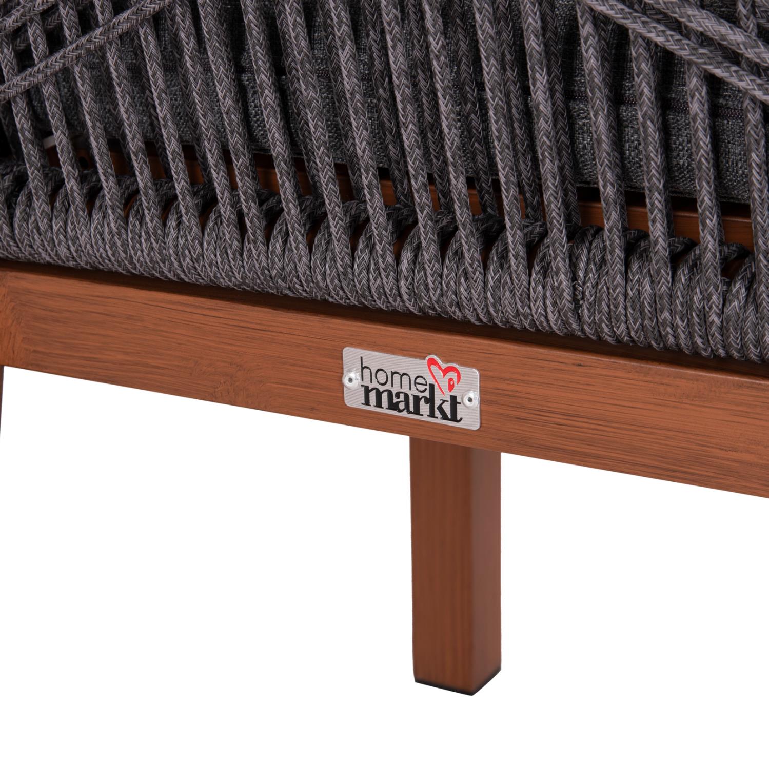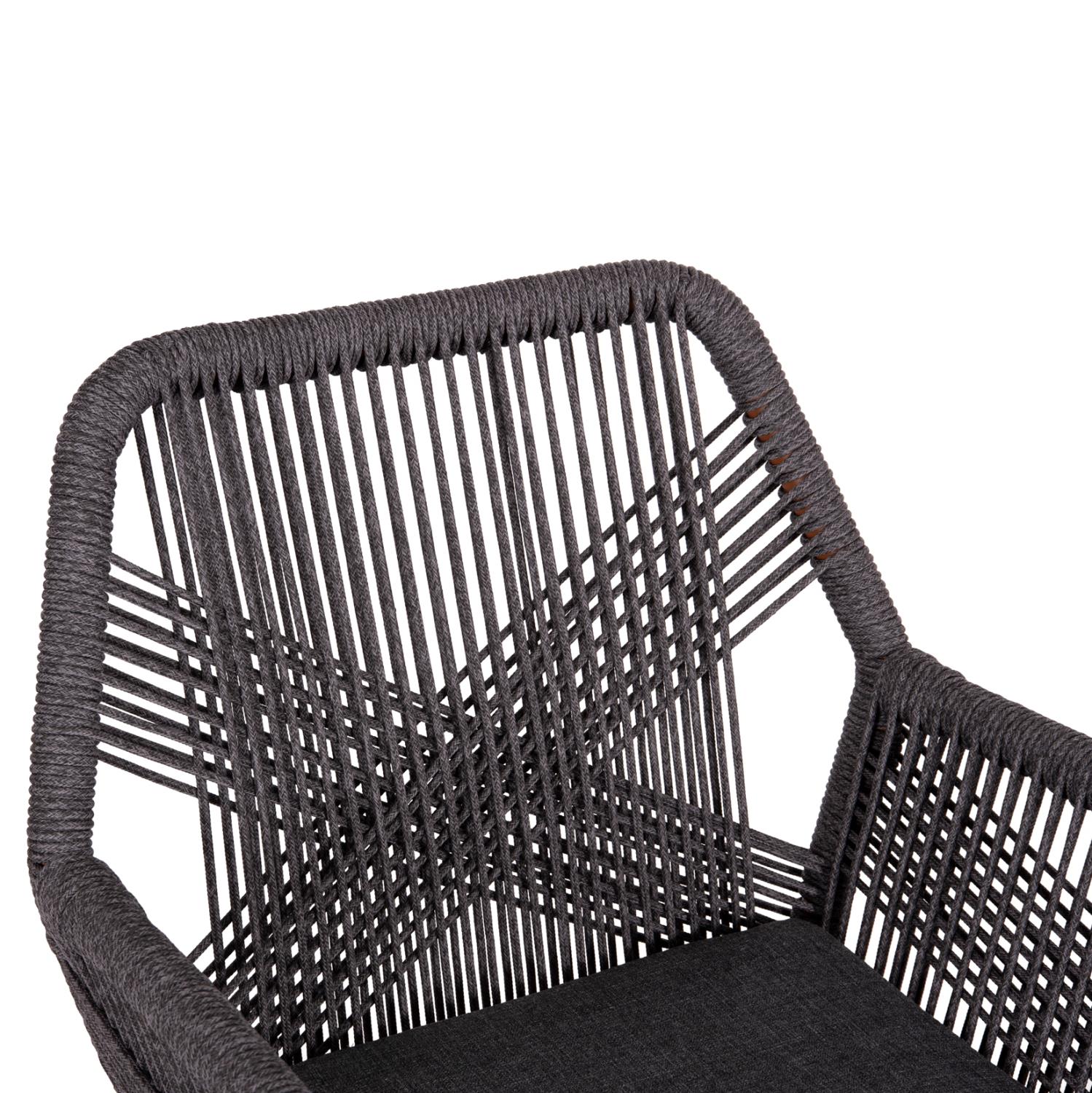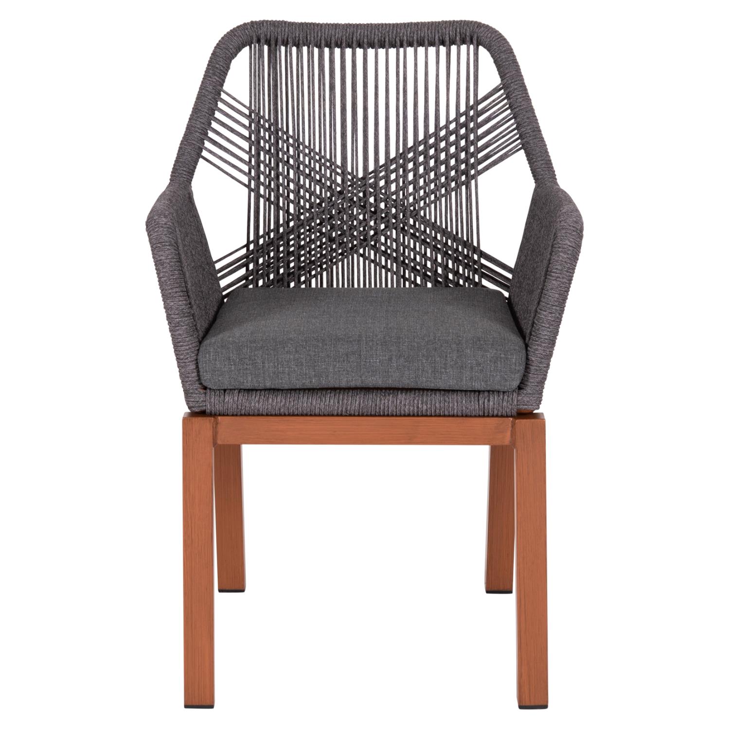 The HOWARD armchair has an aluminum frame in a (grained) BROWN color that resembles natural wood. The back, seat and cushion are made of TEXTILENE rope in DARK GREY color. Ideal for dining areas but also for your home, it will give you comfort and relaxation with the highest possible quality of materials and finishing.