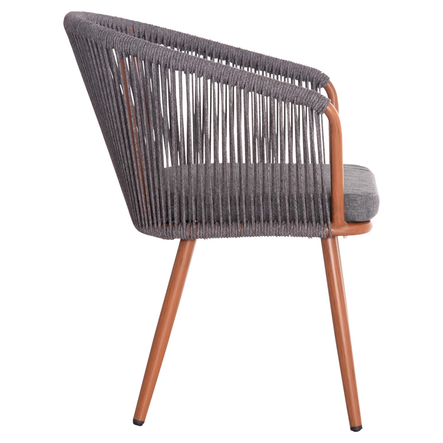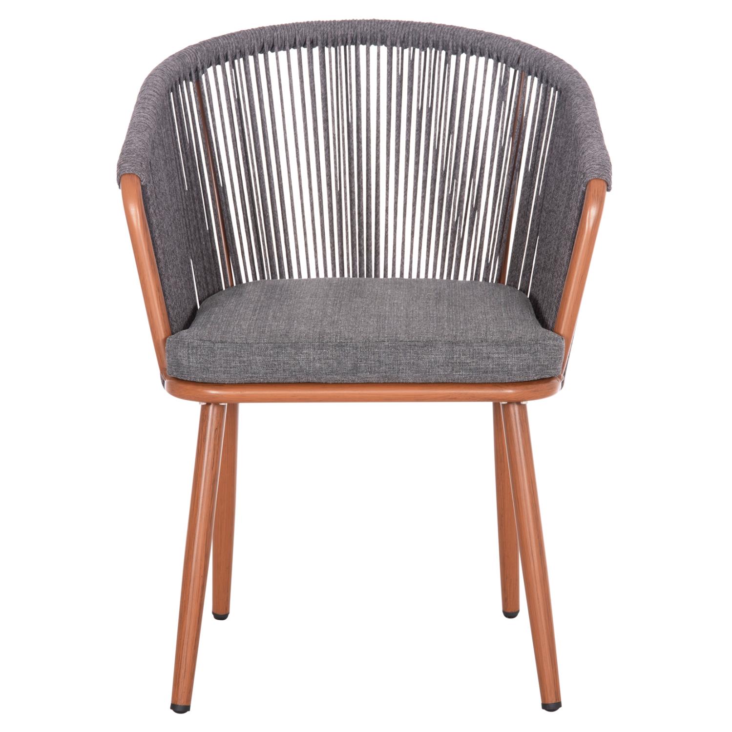 The HARRIET dining armchair, mainly for professional use, is modern, comfortable and stable. Its body-hugging design with the GREY rope on the semi-circular BROWN aluminum frame with sloping arms will aesthetically upgrade the space where you place it in combination with a matching table. Also, the cushion in GREY shade perfectly complements this armchair.
