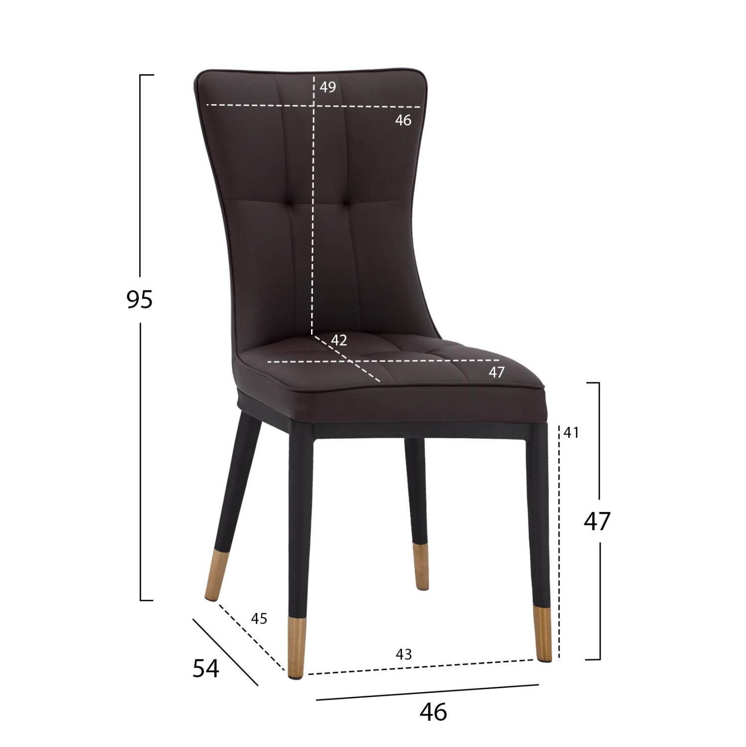 The SAMMY chair is upholstered in synthetic leather in a brown shade, with a black metal frame and gold details.