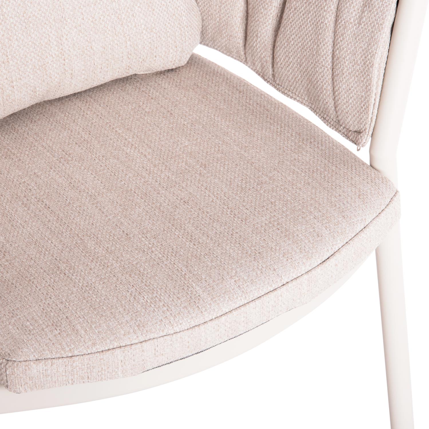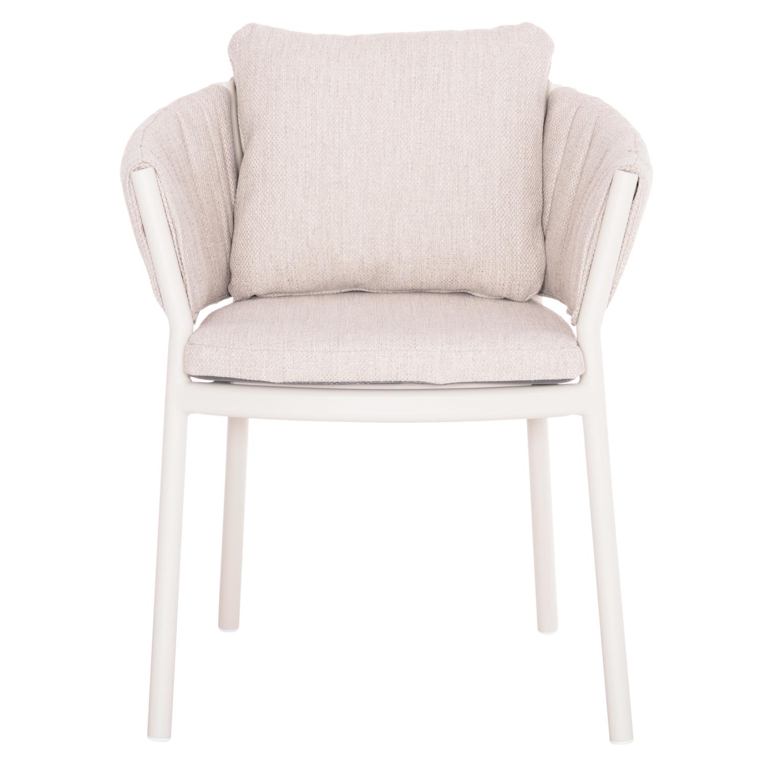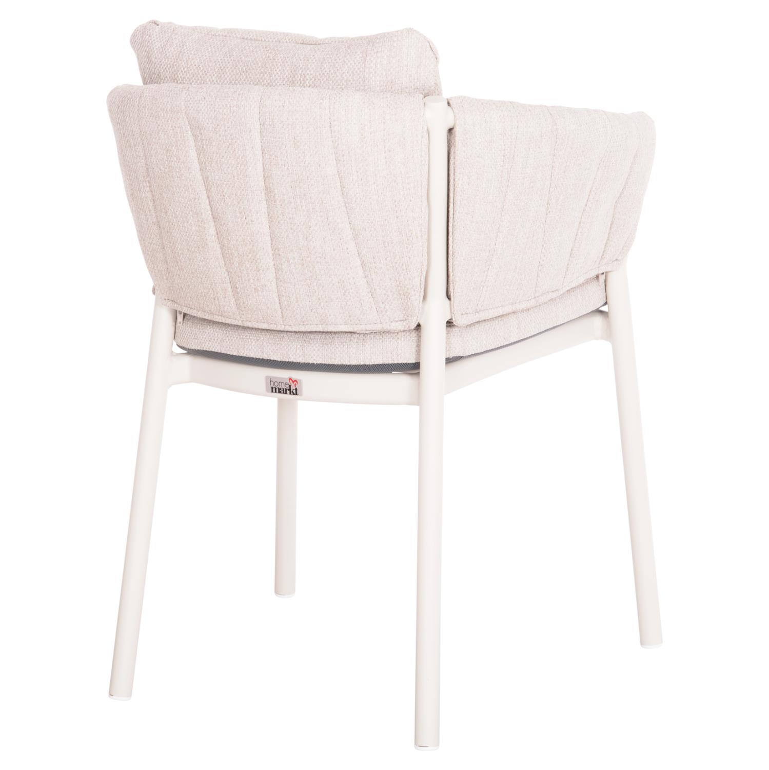 The SHANKS aluminum dining armchair in CREAM WHITE color has a semicircular back and has back and seat cushions. Aesthetically, it is upholstered with OLEFIN fabric, while the cushion covers are also with OLEFIN fabric, in BEIGE color. All you have to do is find the right table to match this lovely armchair.