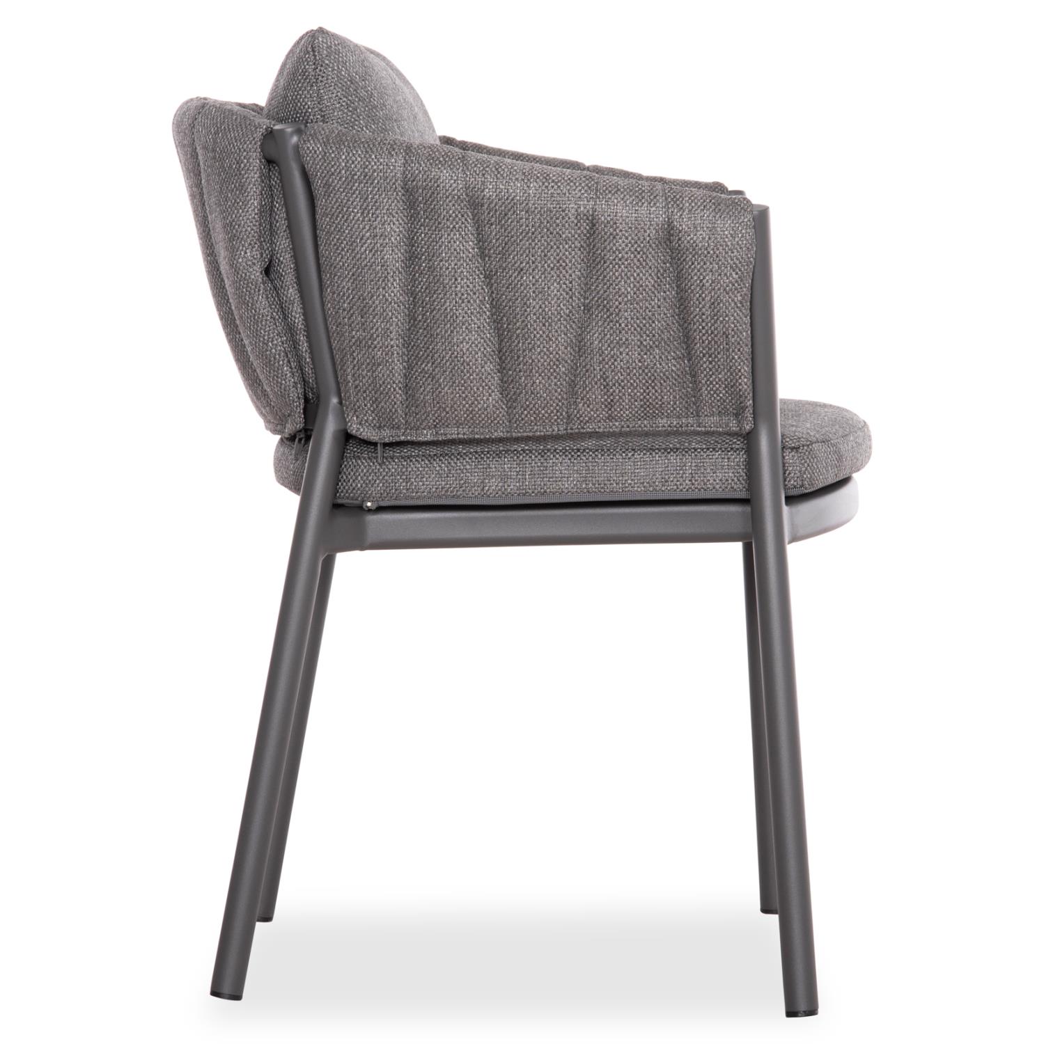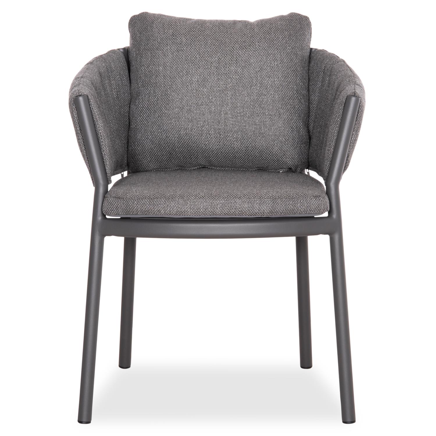 The SHANKS aluminum dining armchair in DARK GRAY color has a semicircular back and has back and seat cushions. Aesthetically, it is upholstered with OLEFIN fabric, while the cushion covers are also with OLEFIN fabric, all in DARK GRAY color. All you have to do is find the right table to match this lovely armchair.