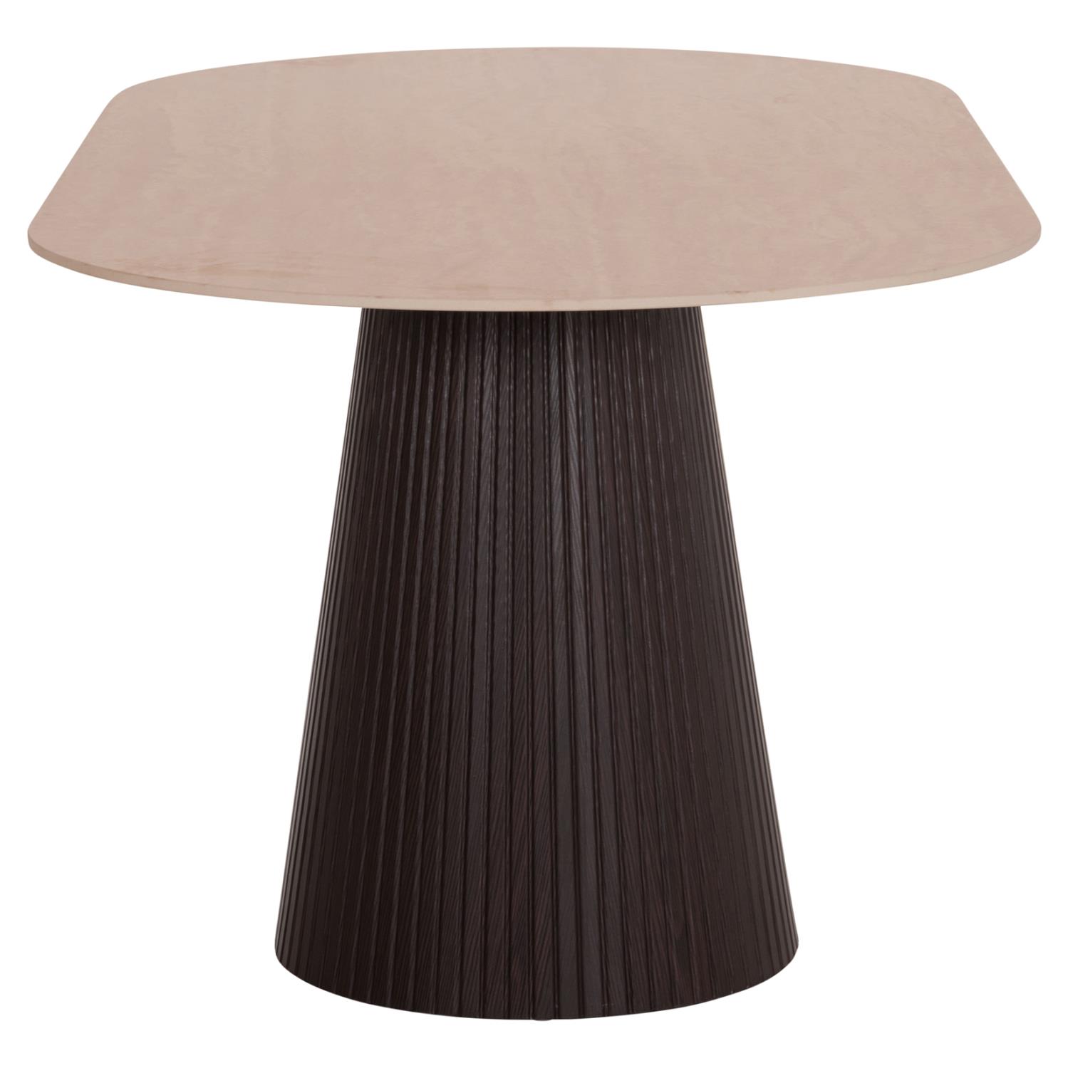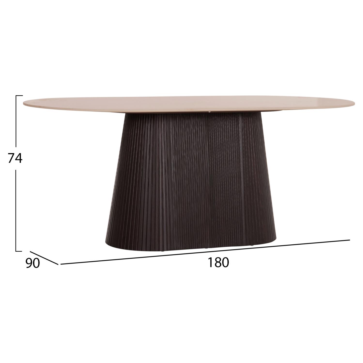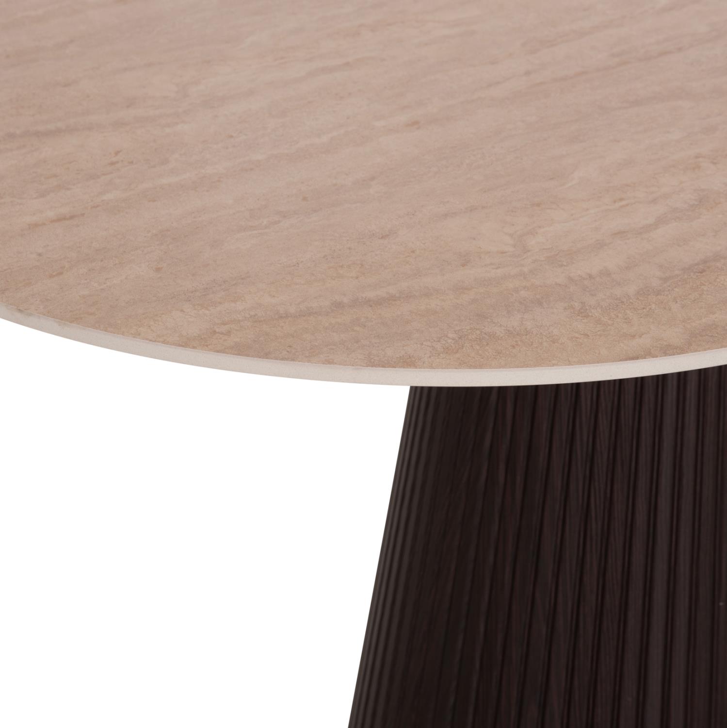 The CATER dining table is proper oval and constitutes a new addition to our range of products. Its flat tabletop is ceramic in TRAVERTINE STONE coloring, while its base is made entirely of MDF in DARK BROWN color, with beautiful pleats (corrugated).
