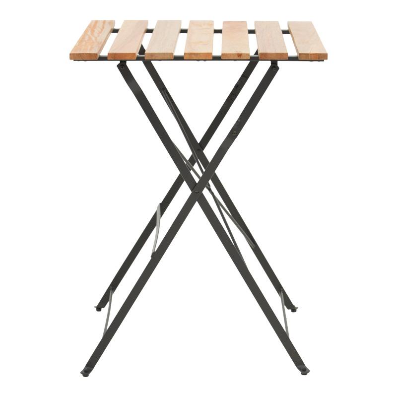 • Construction:Made with a black metal frame and wooden tabletop surface.