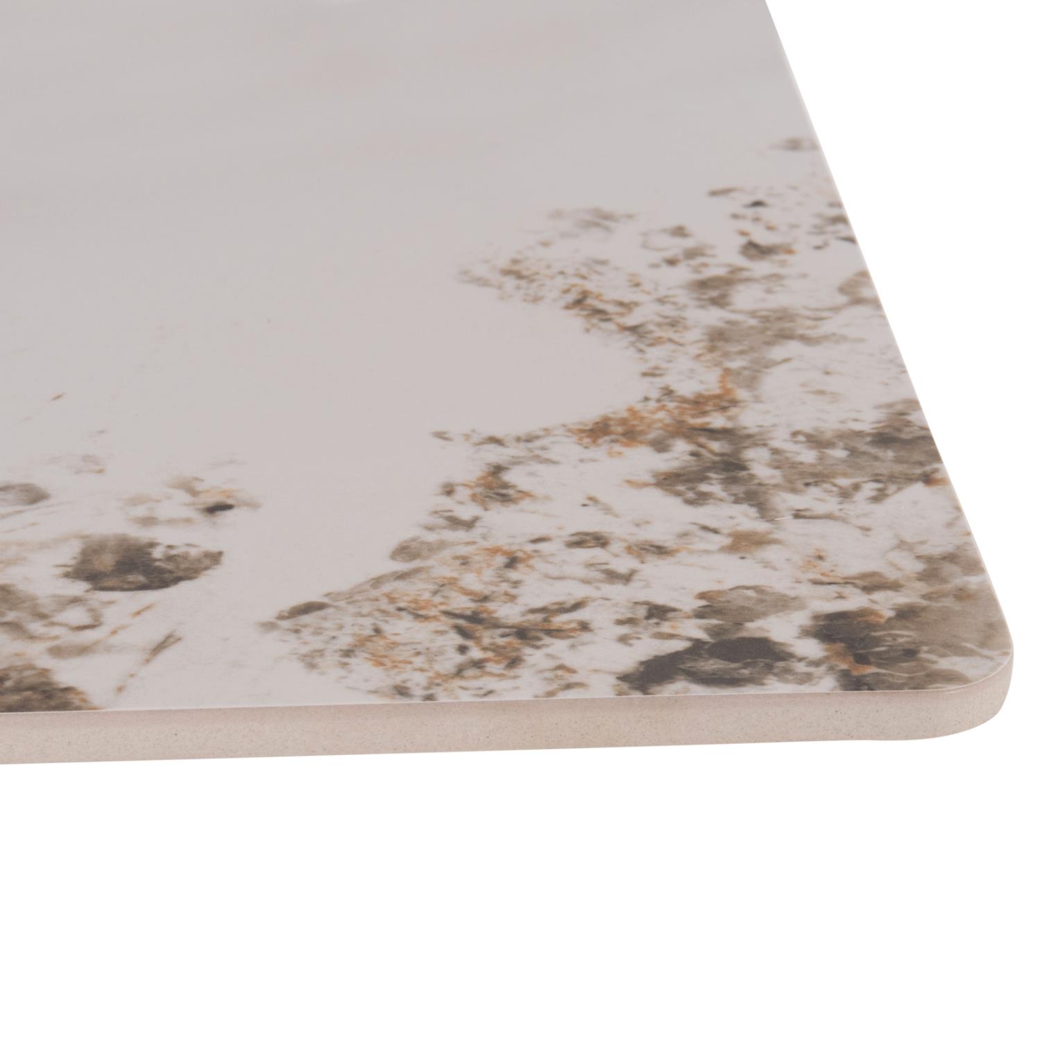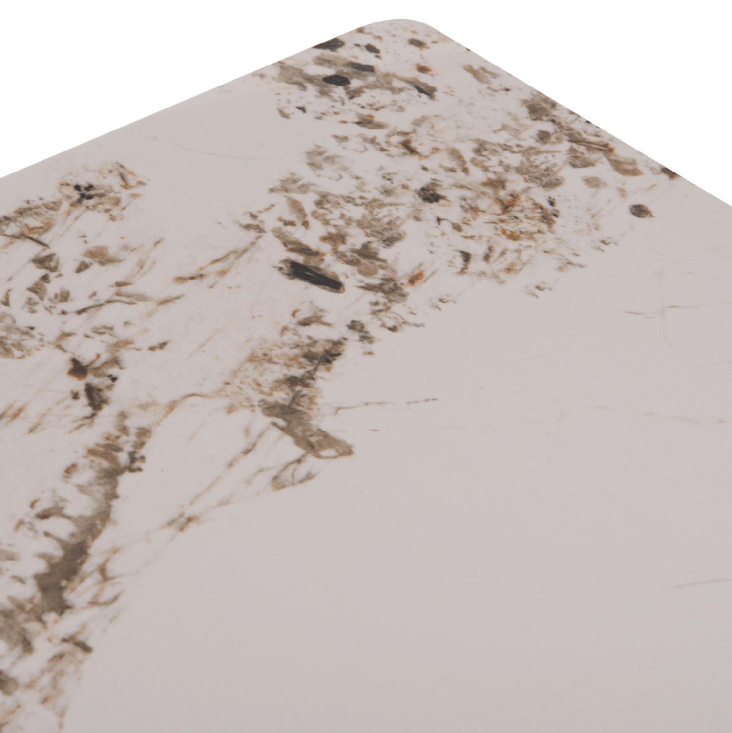 -- The tabletop is made of sintered stone. Of course, it has nothing to do with real stone since that is its scientific term. Sintered stone, therefore, is a matrix (mold) of minerals, such as granite, quartz, pieces of glass, etc., which are heated (fused) to form a solid impermeable mass resulting in a surface that cannot be scratched, etched, burned, or soiled. In fact, even in its properties, this material is very similar to ceramic, but it is even better!