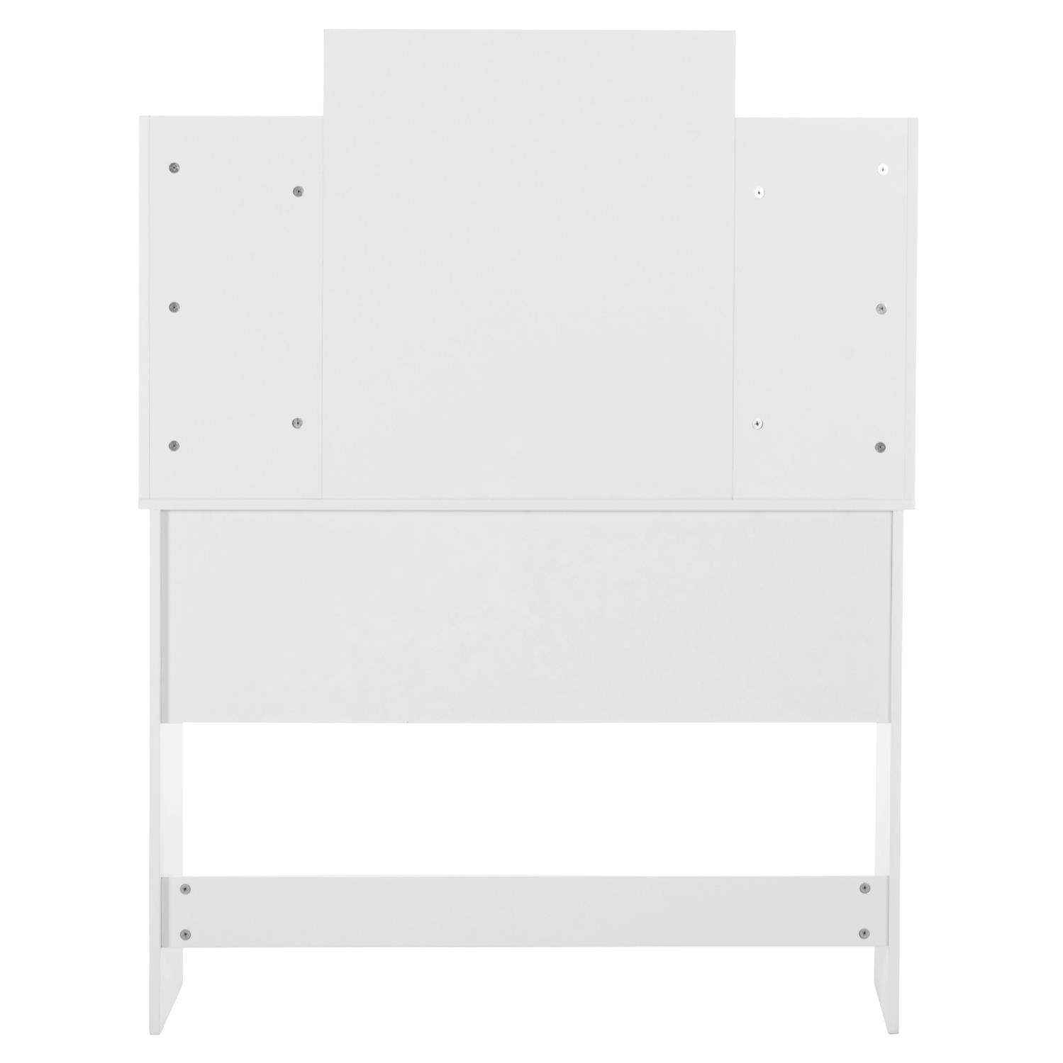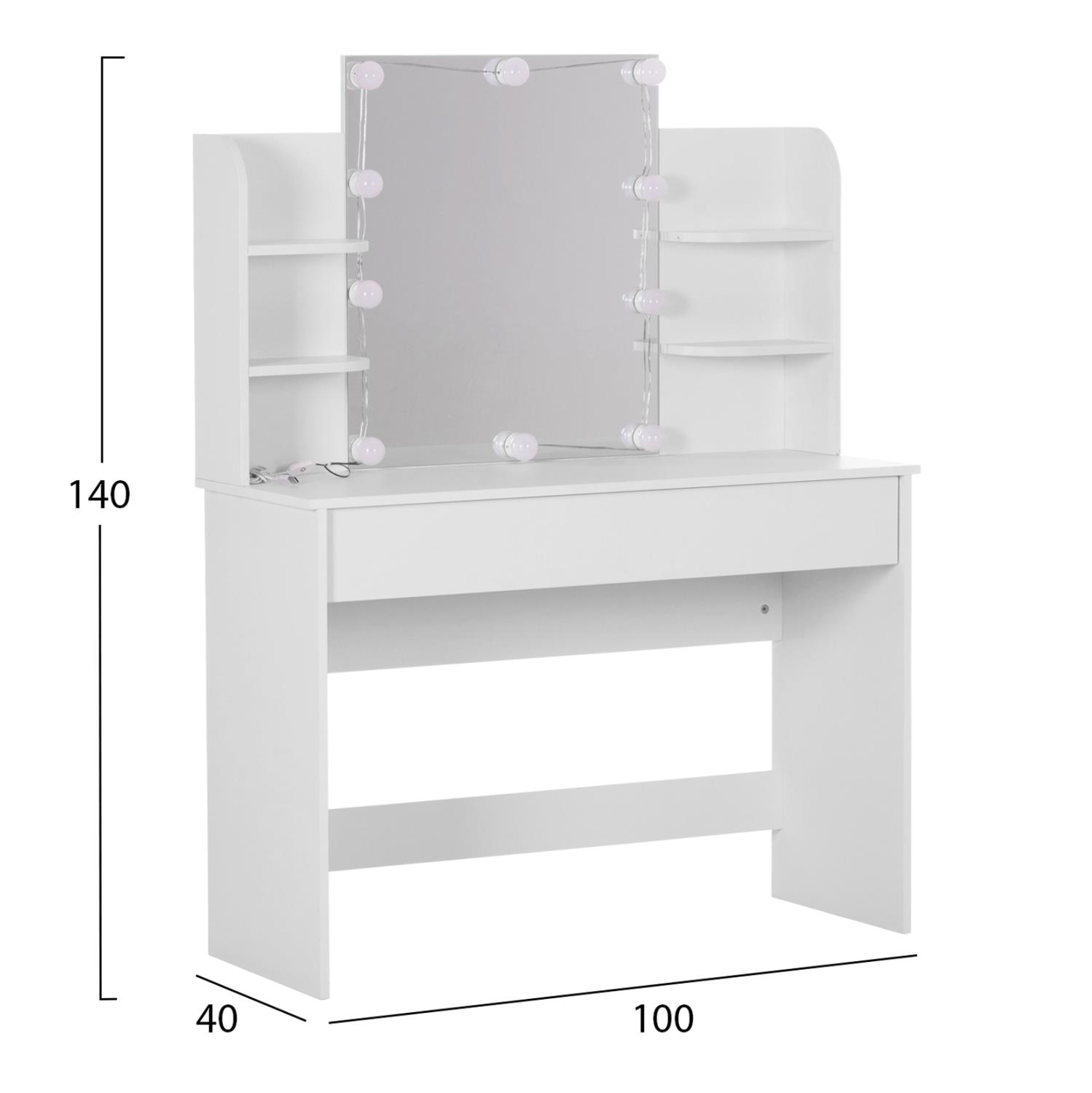 The new LAURYN dressing table is a very practical piece of furniture in WHITE color that will change the image of your space. It consists of a table with a mirror and 2 drawers under the surface. But what sets it apart is that the mirror is placed in the center and is accompanied by LED lights around the perimeter, as well as shelves for placing objects on the right and left, elevating the usefulness of the furniture.
