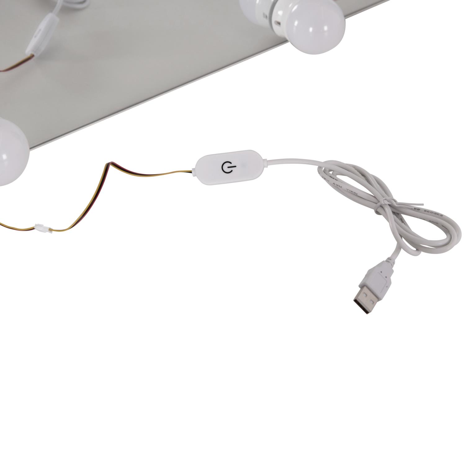 --The bulbs are included separately in the package and stick to the mirror with double-sided adhesive tape. The bulbs are all connected together like a "garland" with the USB power cable. The length of the cable is adjustable from bulb to bulb with a built-in mechanism.