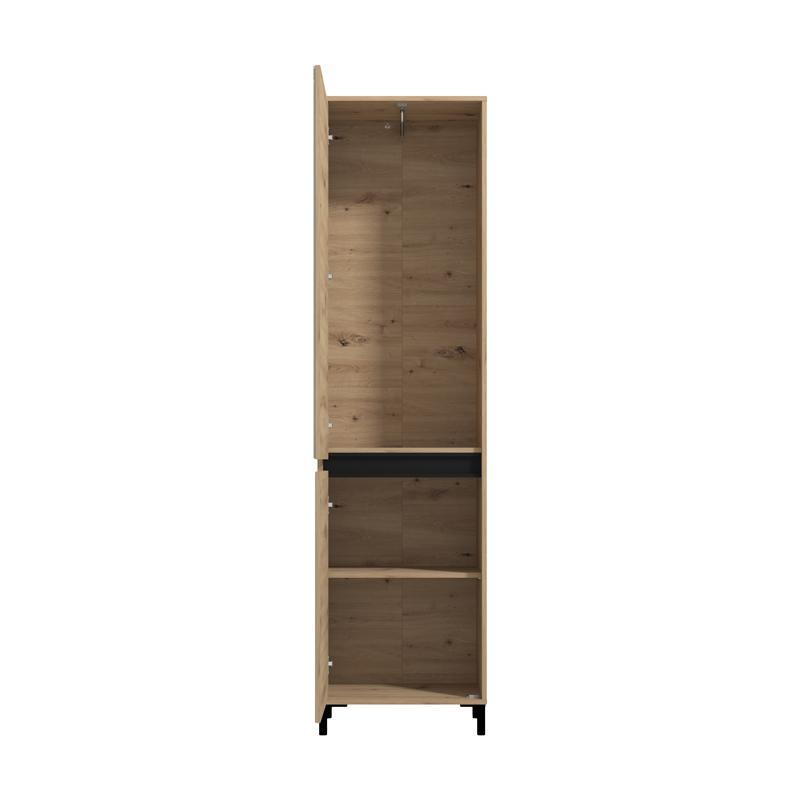 The Arran P1 OG entryway wardrobe, in a natural artisan oak shade, combines storage and aesthetics with a modern and functional design. It has two spacious storage spaces, where on the top there is a hanging rail for your coats and jackets, while on the lower cabinet there is a shelf, ideal for placing shoes, accessories or other items. Its special feature is both the absence of handles, as it has hidden handles, and the fact that on its upper door it has a mirror, offering brightness and depth to the space but also for a final check before leaving the house. With its elegant design, this furniture is ideal for any entrance or hall, offering excellent functionality and aesthetics to your space.