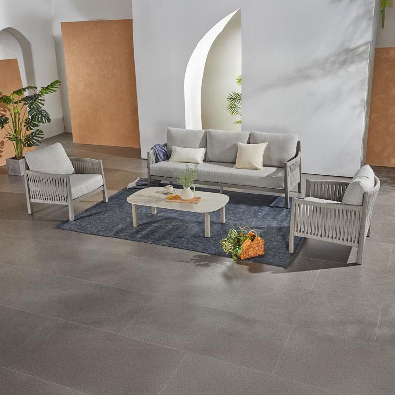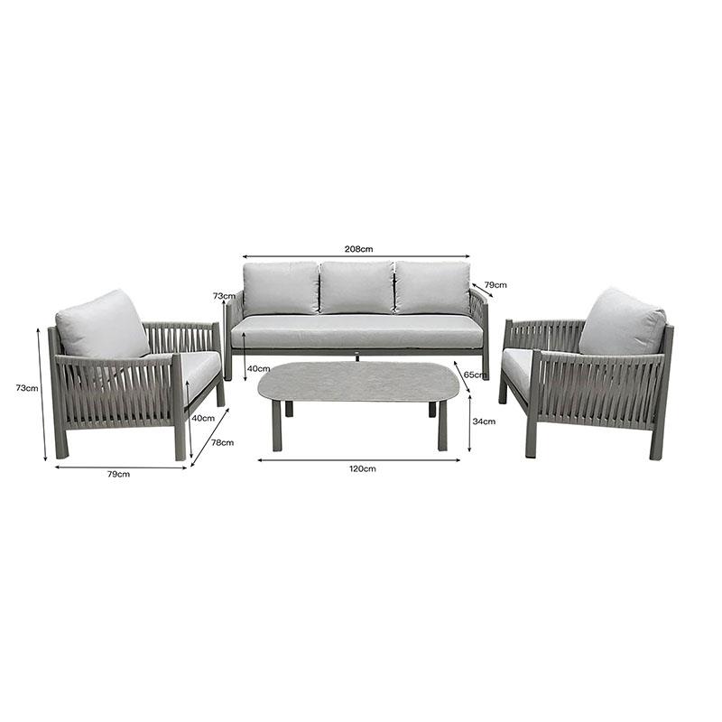 • The upholstery on the two armchairs and the three-seater sofa is premium-quality light gray fabric.