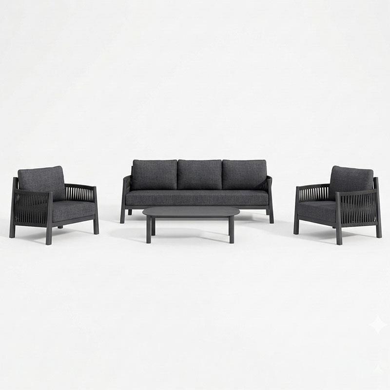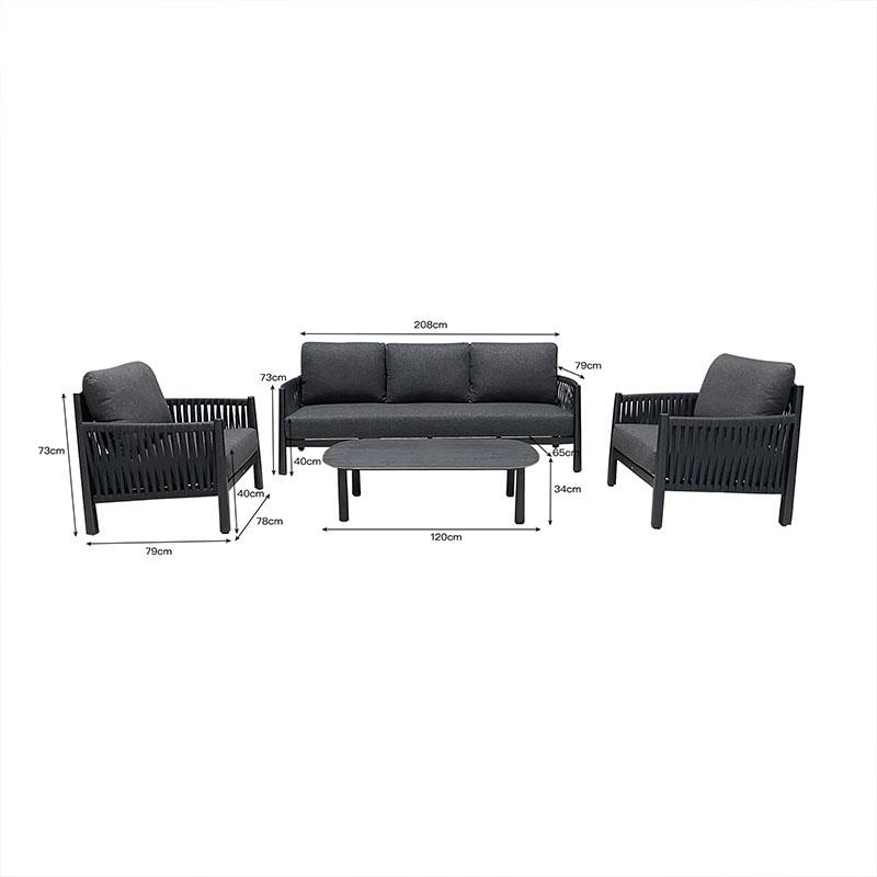 • Upholstery on both the armchairs and the three-seater sofa is made of premium-quality charcoal fabric.