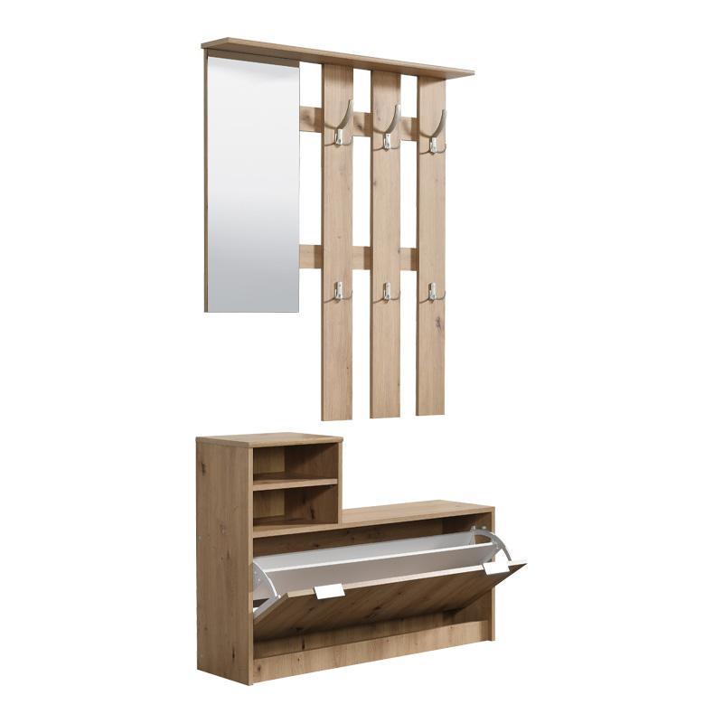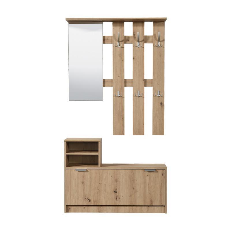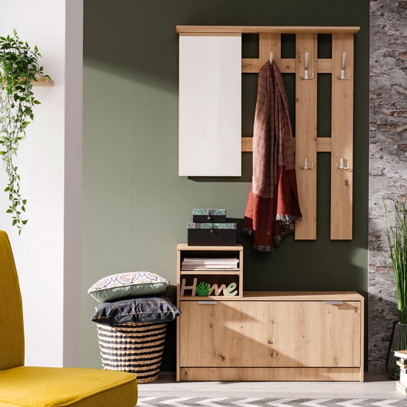 Ravenna is not only practical, but also aesthetically impressive. The combined color of artisan oak and black melamine create a striking contrast, which offers a modern and sophisticated character to your space. The texture of artisan oak offers warmth, while the black finish adds a sense of elegance and modernity. The mirror located on the entryway cabinet offers a last glance before leaving, while at the same time adding depth and brightness to your space.