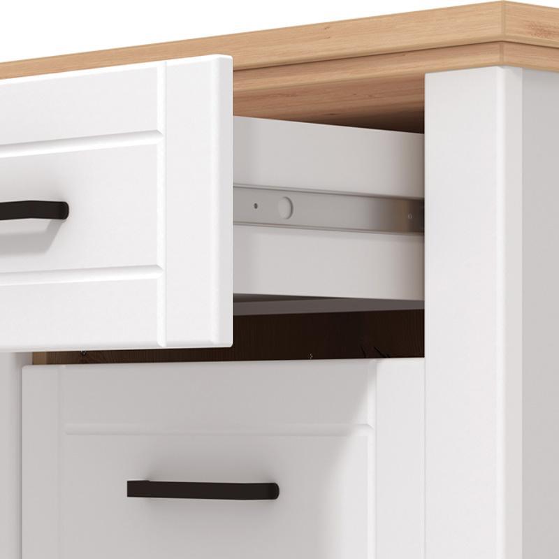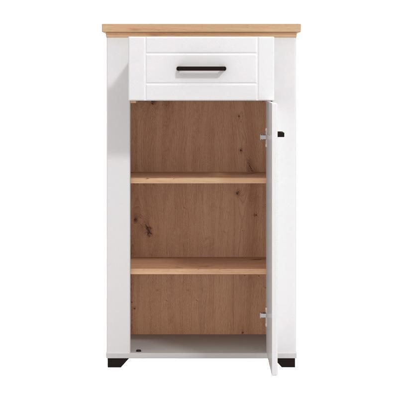 The elegant look of Valencia combines white, artisan oak and white melamine with matte surfaces in MDF, creating a warm and modern atmosphere that easily integrates into any decoration style. The plastic black handle offers ease of use and adds another elegant detail.