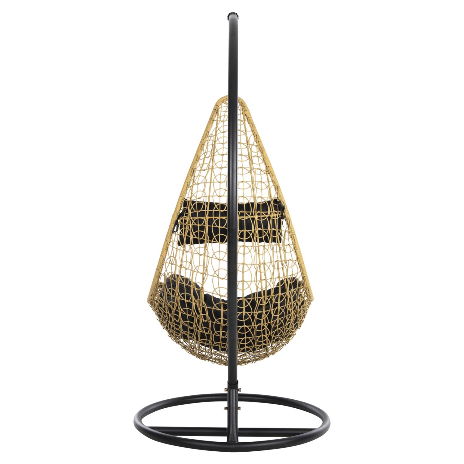 The MILLIE single hanging nest is gorgeous. Throughout time, hammocks are the epitome of carefree and relaxation. We offer you this hanging nest style hammock like a large armchair, made of synthetic Rattan in BEIGE color with BLACK cushions! The round base of the hammock-nest is made of BLACK reinforced metal and the hammock hangs with a chain from one hanging point. This nest can be used for both home and business use.