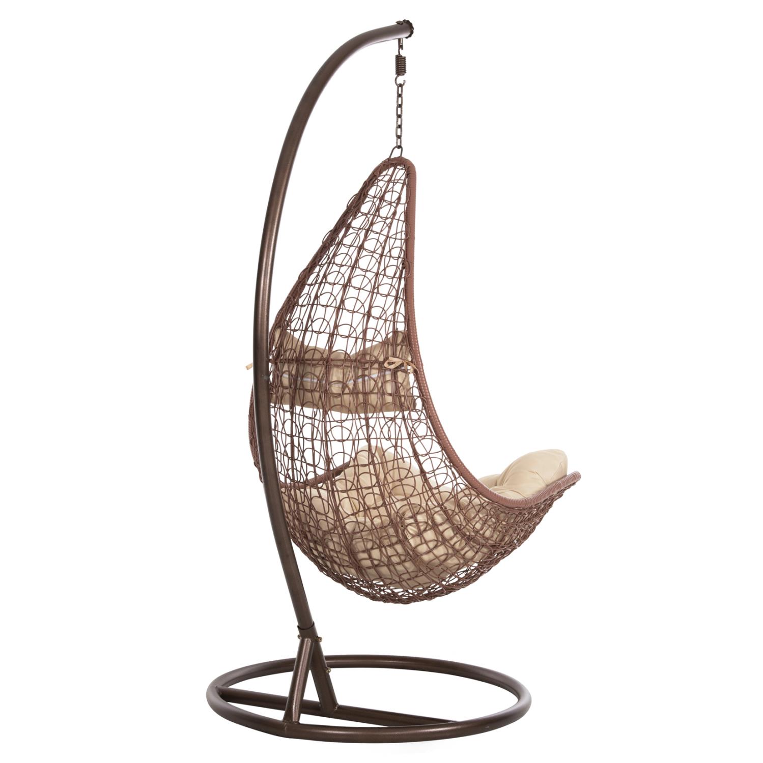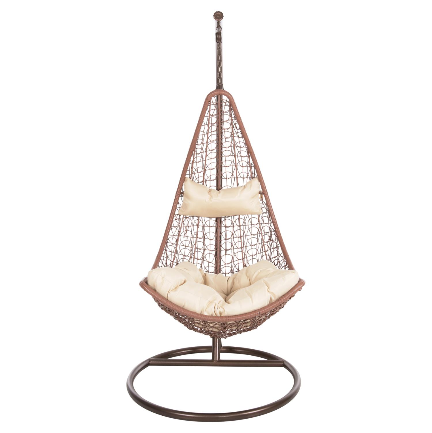 The MILLIE single hanging nest is gorgeous. Throughout time, hammocks are the epitome of carefree and relaxation. We offer you this hanging nest style hammock like a large armchair, made of synthetic Rattan in BROWN color with BEIGE cushions! The round base of the hammock-nest is made of BROWN reinforced metal and the hammock hangs with a chain from one hanging point. This nest can be used for both home and business use.