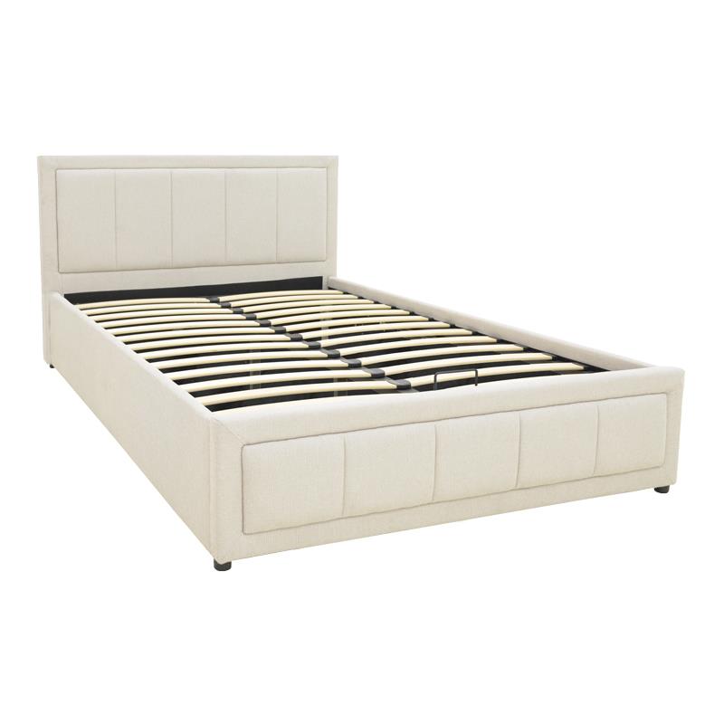 The elegant and practical Huga bed is an excellent solution for any bedroom, offering both comfort and smart storage space. Its construction, upholstered with high-quality fabric, provides a modern and sophisticated aesthetic that seamlessly integrates with all decor styles. It features an easy-to-use mattress lift mechanism, which reveals a spacious storage area underneath. This makes it easy to organize linens, pillows, out-of-season clothing, or other items, contributing to the organization and tidiness of the space. The headboard, with its discreet yet modern quilted design, adds a touch of luxury and comfort, while its neutral shade ensures the bed's versatility to combine with various colorful decorative elements.